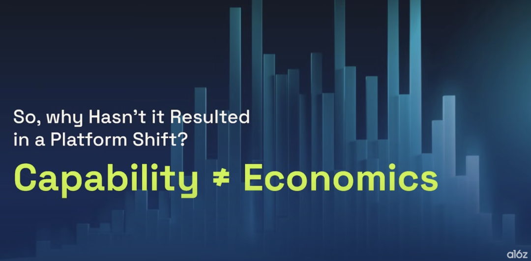 所以,在投资界有一个巨大的难题,这个难题是:如果这东西这么神奇,解决了所有这些问题,为什么我们还没有看到像移动互联网或互联网那样的平台上的转变?这为什么还没有发生?我们公司对此做了很多研究,答案是尽管AI能力像我刚才谈到的那样出色,但并没有像互联网或移动互联网的经济效益。原因有很多,我就不一一列举了,但我会简要介绍其中的一些。