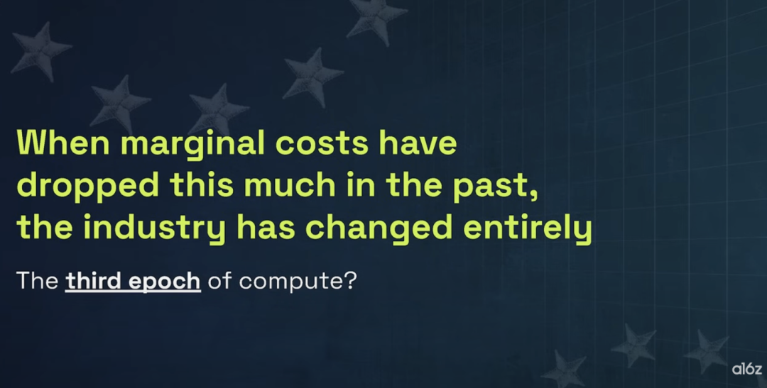 人工智能的未来令人惊叹。在这篇来自a16z的合伙人Martin Casado的演讲中。Martin 指出,历史上曾发生两次边际成本大幅下降,而发生的平台转移和行业革命的案例:芯片将计算的边际成本降低到了零,互联网将分发的边际成本降到了零。此时此刻,恰如彼时彼刻,大模型将创造的边际成本降到了零,一场令人惊叹的AI革命即将开始,这是所有风险投资人感到如此兴奋的原因