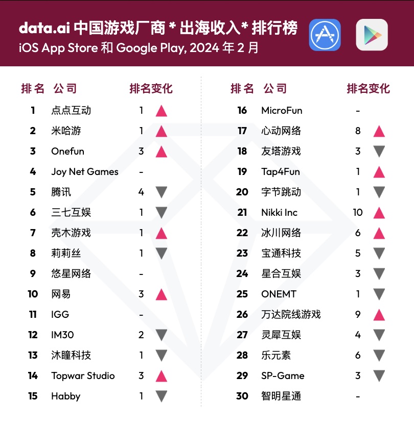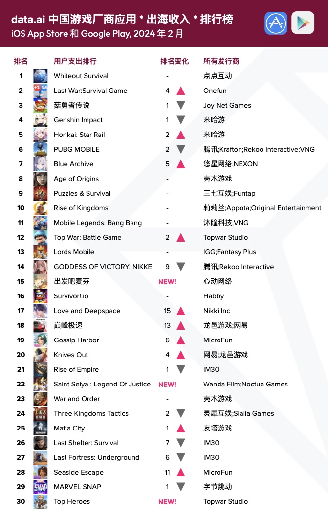 2024 年 2 月中国游戏厂商及应用出海收入排行榜出炉。点点互动成功登顶出海收入榜,米哈游紧随其后,两者均实现 1 亿美元营收的亮眼成绩,月环比增长率分别为 1.5%、3.6% 。Onefun 本期顺位再进 3 名,来到第 3 。旗下包含休闲副玩法的 4X 行军战斗手游 Last War 继续在韩国、美国、台湾地区持续吸金,帮助发行商收入环比增长 67% 。网易旗下多款游戏迎来显著增长,帮助发行商收入排名上升 3 位至第 10 :Knives Out(荒野行动)开启 33 赛季,并与《进击的巨人》进行联动,推出艾伦、三笠等人气角色服装,仅日服月度用户支出增长便突破 160 万美元;Identity V(第五人格)开启春节主题活动,海外用户支出环比增长 21.6% ;LifeAfter(明日之后)则陆续推出“希望电台”全新剧情、守卫金龙雕像玩法等全新内容,驱动海外用户支出增长 101% 。叠纸游戏凭借新游 Love and Deepspace(恋与深空)实现海外收入增长,游戏自 2 月 5 日起完成情人节相关内容更新(包括“无人知晓时”思念许愿概率提升、“燃情漫想”活动等),再次引爆多地市场玩家付费意愿,仅当天全球支出便达到 250 万美元。该游戏已成为 2024 年截至目前全球用户支出最高乙女恋爱游戏,叠纸游戏也因此排名攀升至第 21 位,成为 Top 30 中涨幅最大的出海发行商。其余排名上升明显的发行商还包括 Topwar Studio、心动网络、冰川网络以及万达院线游戏。