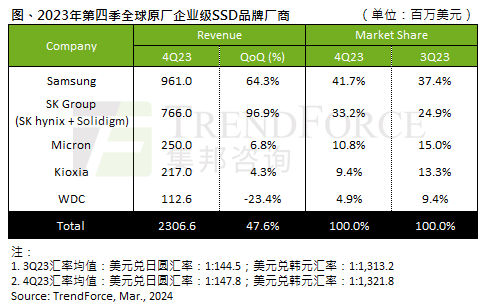 2023年第四季成长幅度最高的为SK集团(SK Group),Enterprise SSD领域营收达7.66亿美元,季增96.9%。受惠于北美主要客户备货需求回升,SK集团全力支援相关产品供应;三星(Samsung)营收成长幅度居次,季增64.3%,达9.61亿美元,随着减产效益浮现,订单动能回升带动价格反弹,进一步带动营收和出货大幅成长;美光(Micron)受惠于第四季Enterprise SSD合约价上涨,营收约2.5亿美元,季增6.8%。目前美光积极布局Enterprise SSD,随着PCIe 4.0产品逐渐放量,加上232层产品开始供客户验证,制程领先将有助于扩大市占率。 铠侠(Kioxia)2023年第四季营收为2.17亿美元,季增4.3%。其中,PCIe 4.0出货量渐增,主要因为此次价格反弹迅速,市场龙头供应商在相关零部件供应不及之下,Kioxia因此受惠;西部数据(Western Digital)受主力产品需求减少冲击,第四季营收为1.13亿美元,季减23.4%。考量西部数据目前PCIe产品验证客户较为局限,未来产品竞争处于较不利的状况。尤其西部数据受限于自制主控芯片的策略考量,研发重心专注于Client SSD产品发展,未来Enterprise SSD产品成长力道将面临挑战。