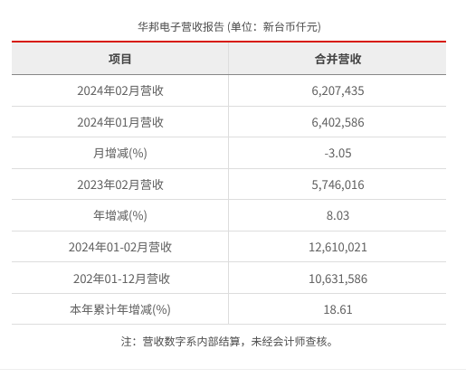 华邦电子股份有限公司近日公布自行结算的2024年2月份营收报告。华邦含新唐科技等子公司,2月份合并营收为新台币62.07亿元,较上个月减少3.05%,较去年同期增加8.03%。累计2024年1至2月合并营收为新台币126.1亿元,较去年同期增加18.61%。