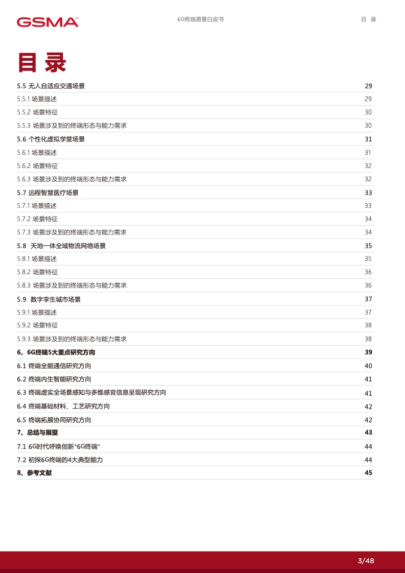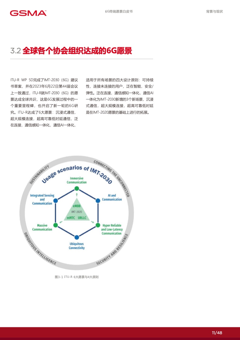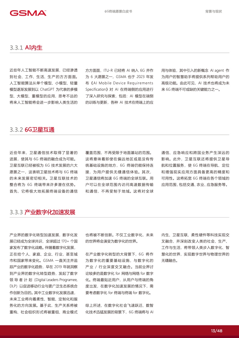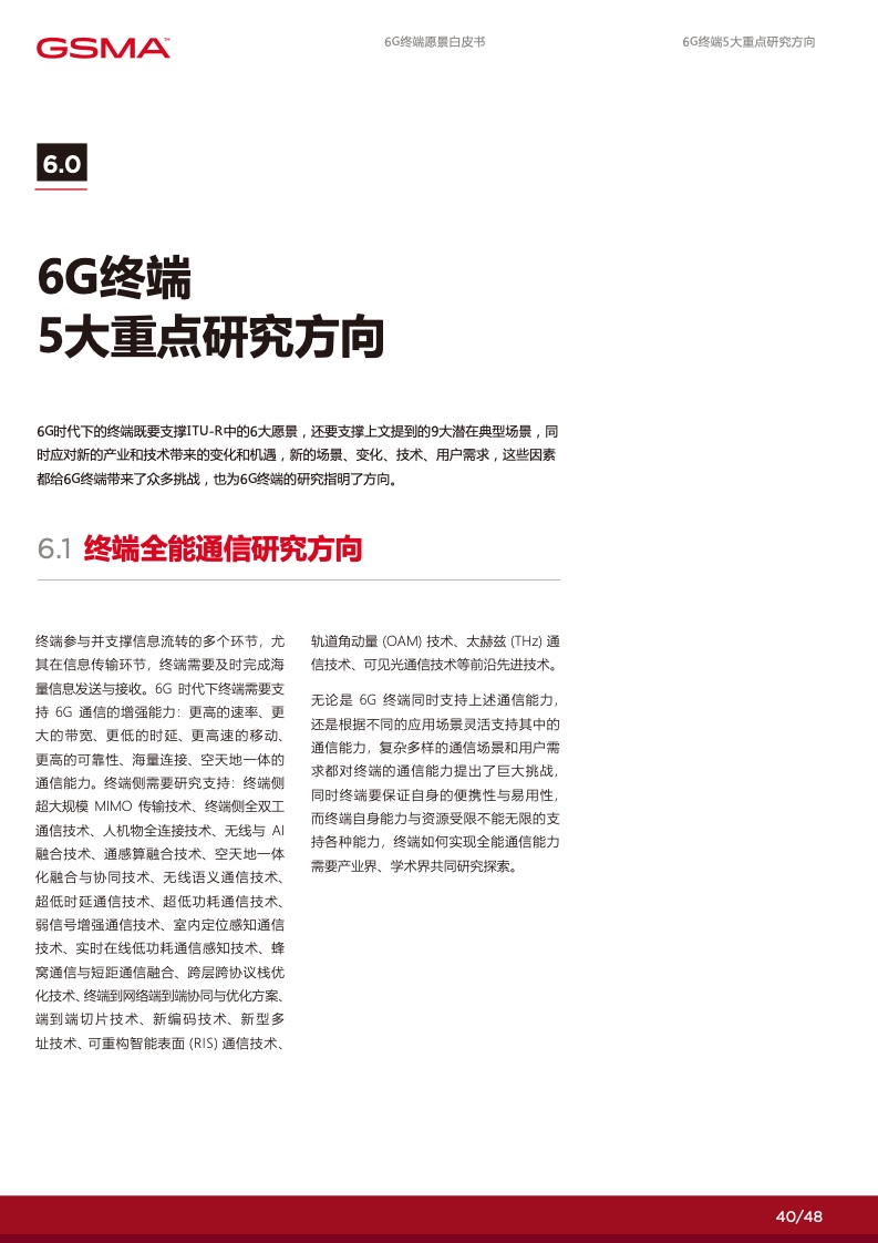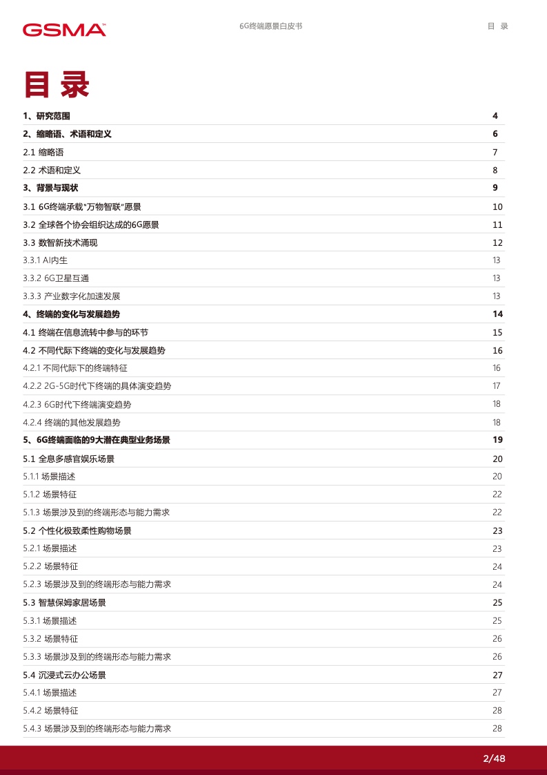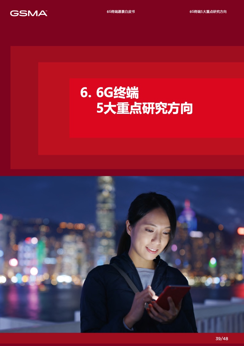 在 6G 赋能的数字化时代里,个人将拥有 更多定制化的数字服务使得社交沟通更加 便捷,家庭将通过智能化的家居系统提高 生活品质,产业将通过数智化技术实现增 效拓能。各行各业将逐渐摆脱传统的限制, 通过数字化手段创造出全新的商业模式和 机会。然而,要实现这一切,并迈入更高 级别的数字化社会,6G 终端将发挥关键 作用。数字化的广泛应用和全球数字化战 略的制定为 6G 终端的新能力提出了迫切 的需求,6G 终端将成为数字化时代的引 擎,满足不断增长的数字化需求,推动人 类社会迈向更加智能、高度互联的未来。