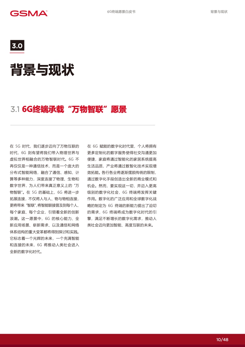 在 5G 时代,我们逐步迈向了万物互联的 时代,6G 则有望将我们带入物理世界与 虚拟世界相融合的万物智联时代。6G不再仅仅是一种通信技术,而是一个庞大的 分布式智能网络,融合了通信、感知、计 算等多种能力,深度连接了物理、生物和 数字世界,为人们带来真正意义上的 “万 物智联”。在 5G 的基础上,6G 将进一步 拓展连接,不仅将人与人、物与物相连接, 更将带来 “智联”,将智能联接普及到每个人、 每个家庭、每个企业,引领着全新的创新 浪潮。这一愿景中,6G 的核心能力、全 新应用场景、崭新需求、以及通信和网络 体系结构的重大变革都将得到探讨和实践。 它标志着一个光辉的未来,一个充满智能 和连接的未来,6G 将推动人类社会进入 全新的数字化时代。