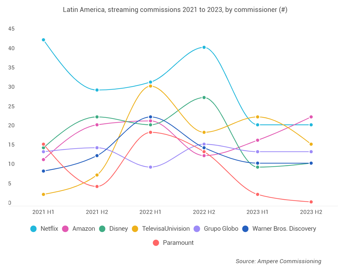 例如,迪士尼在此期间的流媒体项目下降了45%,而Netflix的项目下降了43%。竞争对手派拉蒙(Paramount)在2023年仅宣布在拉丁美洲推出四部电影。事实上,尽管派拉蒙将保留其在阿根廷和智利的内容渠道,但作为其摆脱本地化、国际化内容的总体战略的一部分,它正在撤出该地区的其他地方。