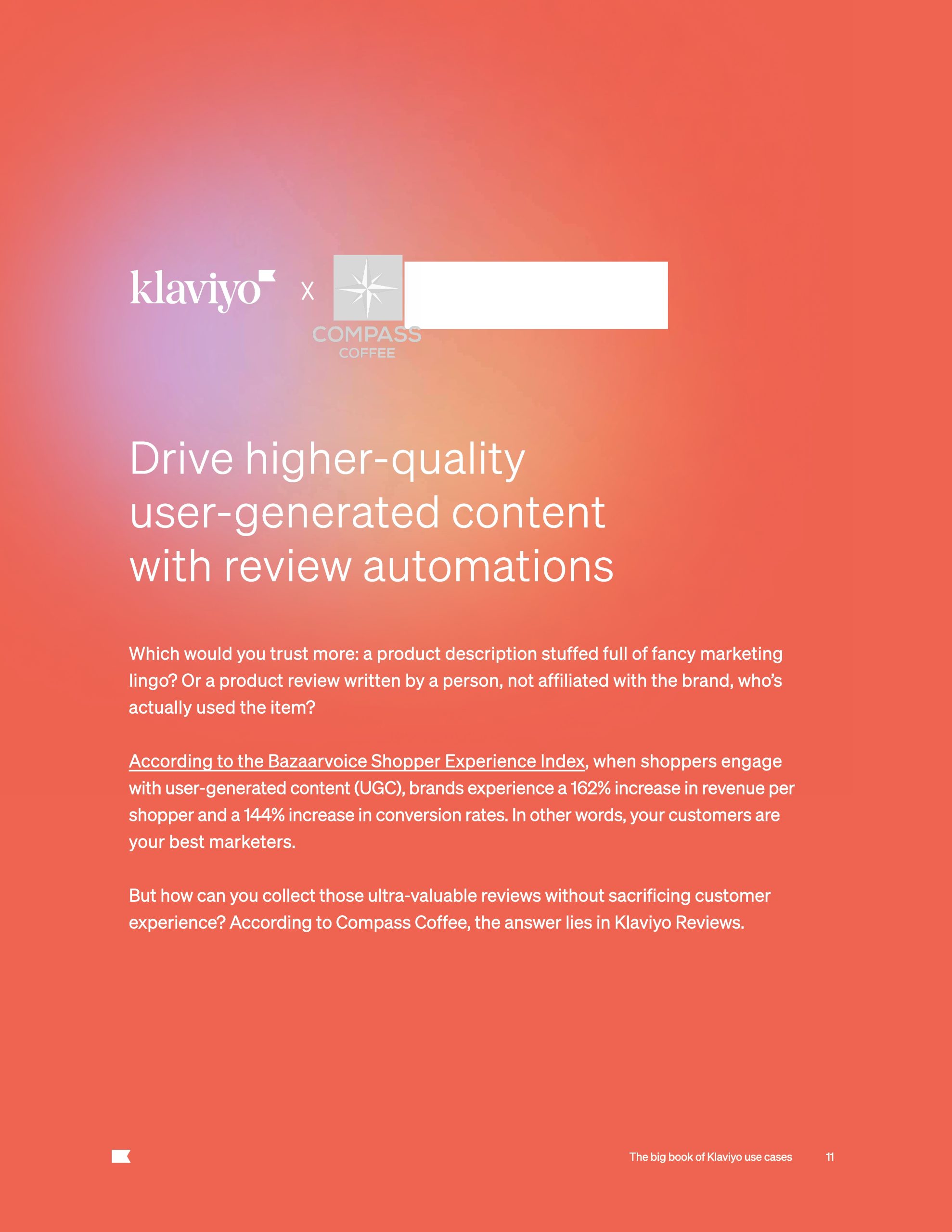 根据Bazaarvoice购物者体验指数,当购物者参与用户生成的内容(UGC)时,品牌的每位购物者收入增长162%,转化率增长144%。
