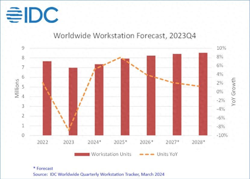 IDC在概述其预测时表示,工作站出货量在2024年将增长5.2%,然后在2025年,随着客户寻求在2025年10月Windows 10退役日期前过渡到Windows 11,增长势头将逐渐增强,增长率将突破7.9%。此后,IDC 预计该领域的增长将趋于缓和。