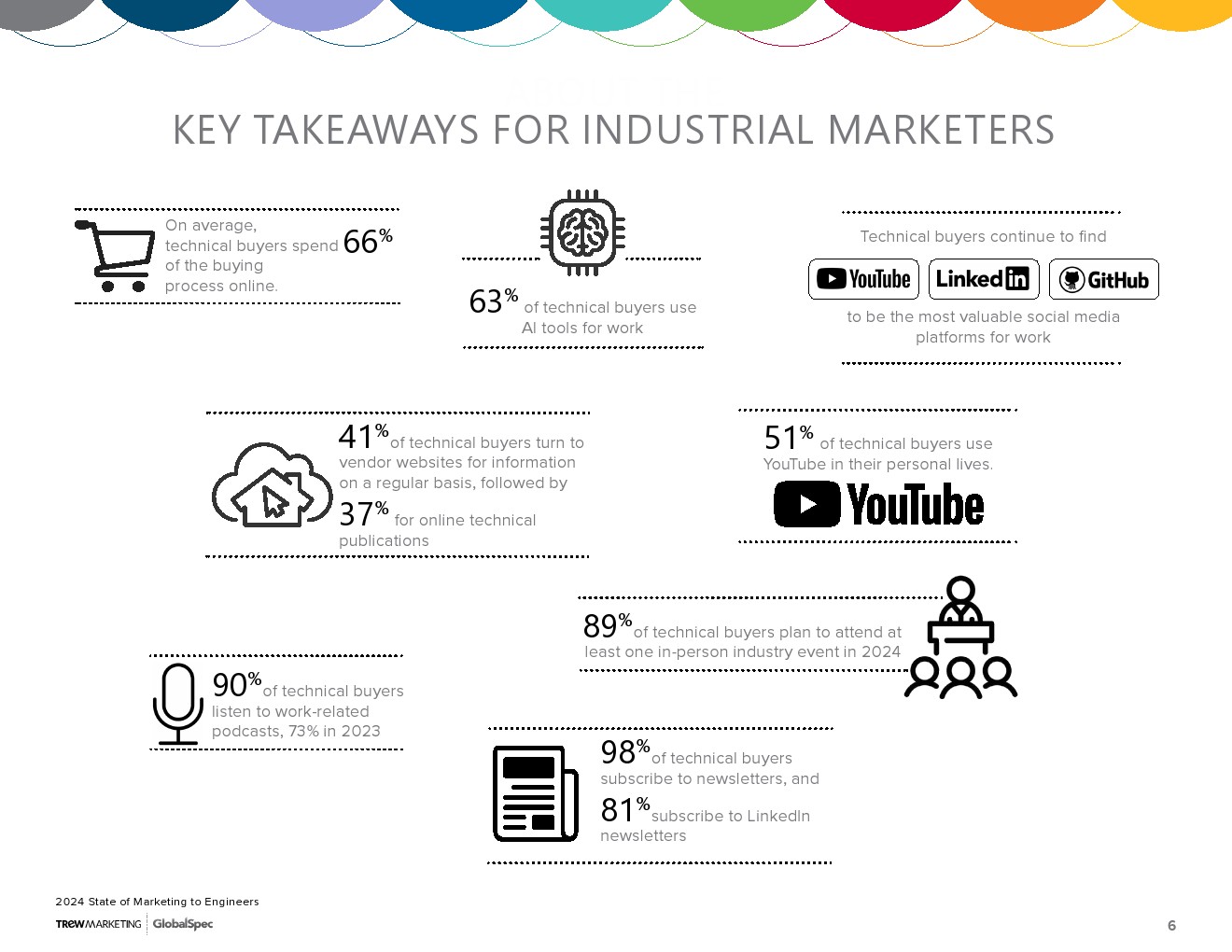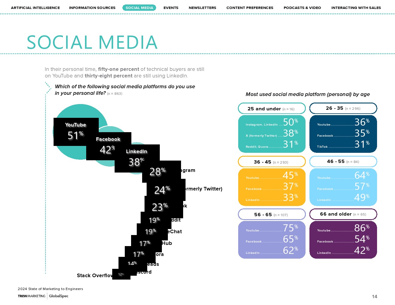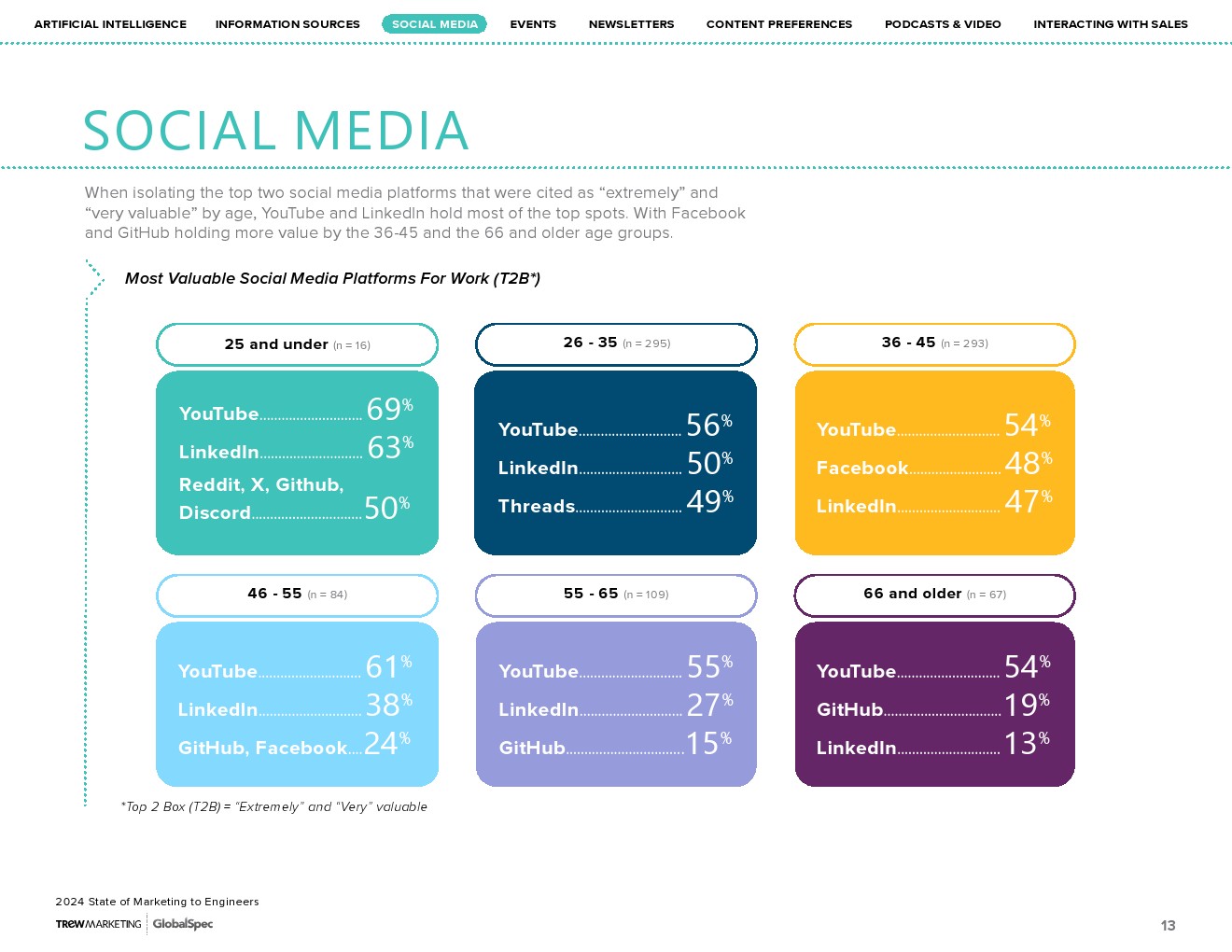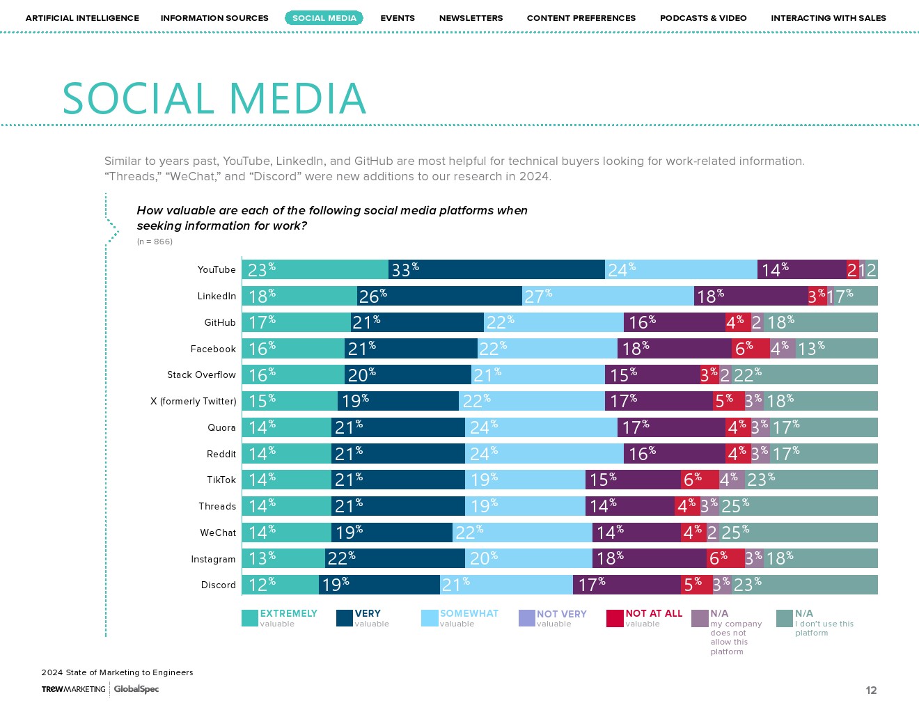 GlobalSpec和TREW Marketing发布了“2024年面向工程师的营销报告”。社交媒体视频被B2B营销人员认为是最有效的视频内容类型,它们确实很可能在技术买家中找到观众。GlobalSpec和TREW Marketing对全球900多名工程师和技术专业人士进行的调查发现,YouTube被认为是寻找工作信息时最有价值的社交媒体平台,大多数人认为它极有价值(23%)或非常有价值(33%)。