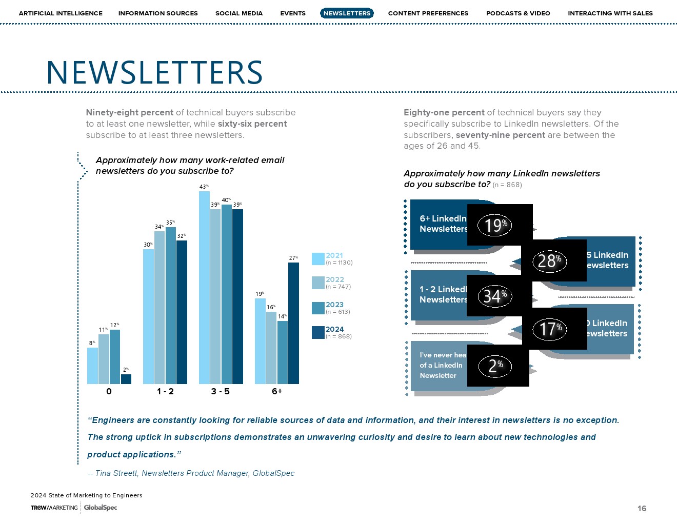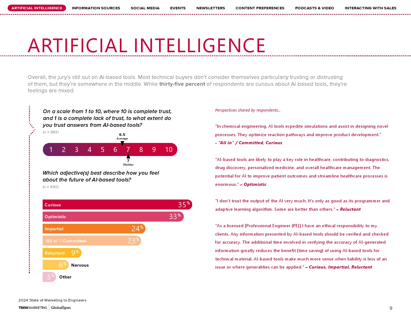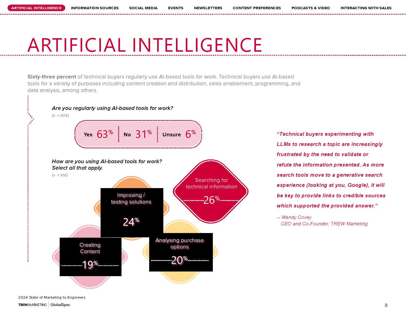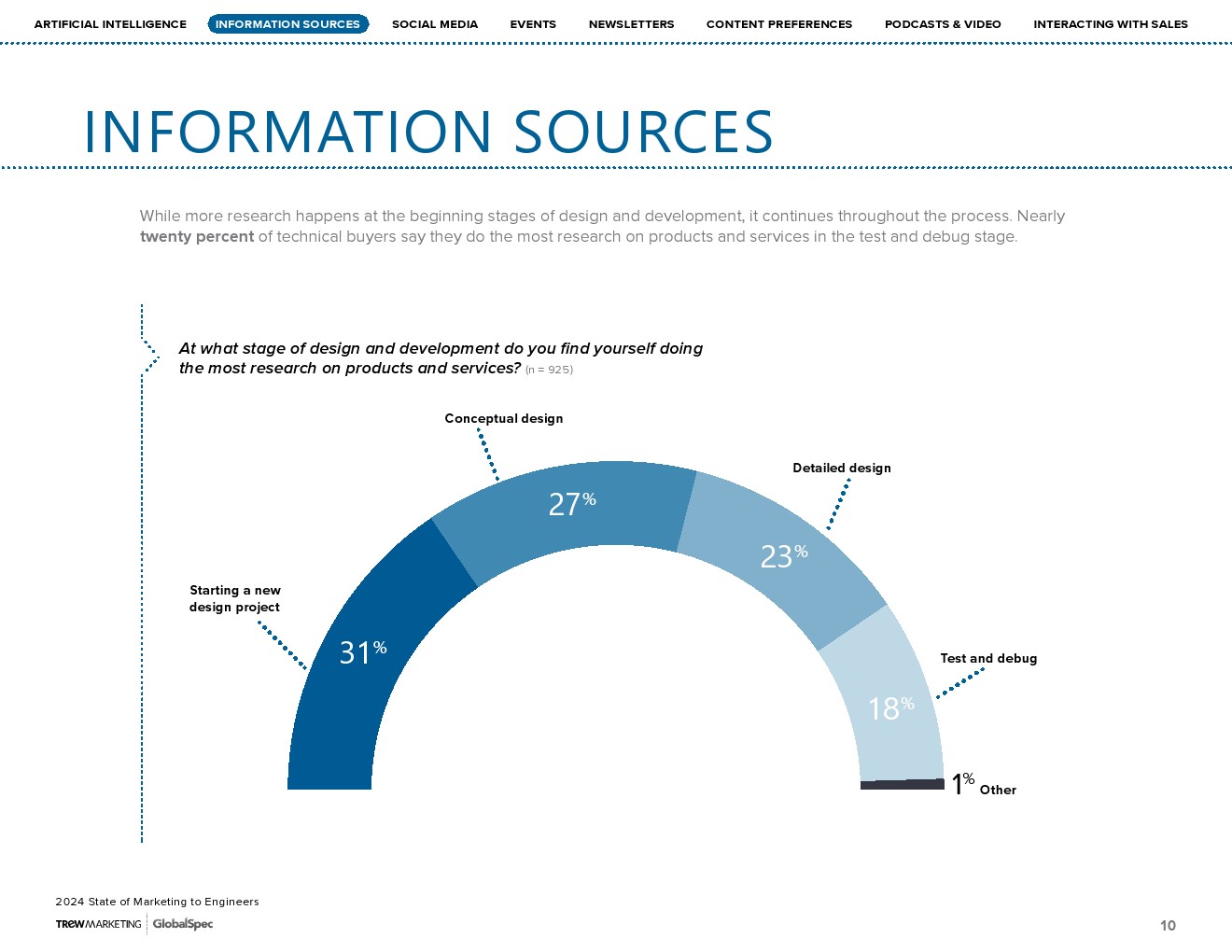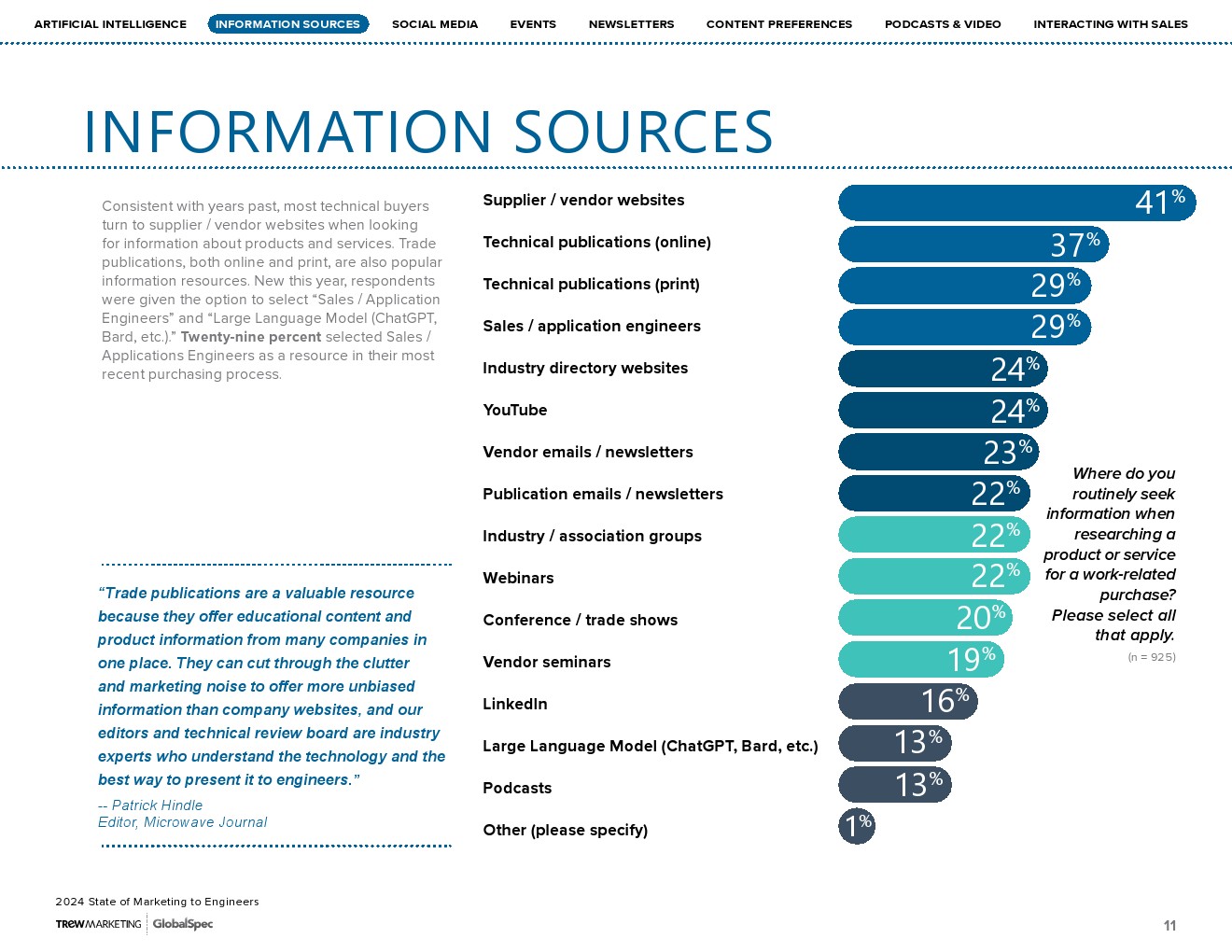 GlobalSpec和TREW Marketing发布了“2024年面向工程师的营销报告”。社交媒体视频被B2B营销人员认为是最有效的视频内容类型,它们确实很可能在技术买家中找到观众。GlobalSpec和TREW Marketing对全球900多名工程师和技术专业人士进行的调查发现,YouTube被认为是寻找工作信息时最有价值的社交媒体平台,大多数人认为它极有价值(23%)或非常有价值(33%)。