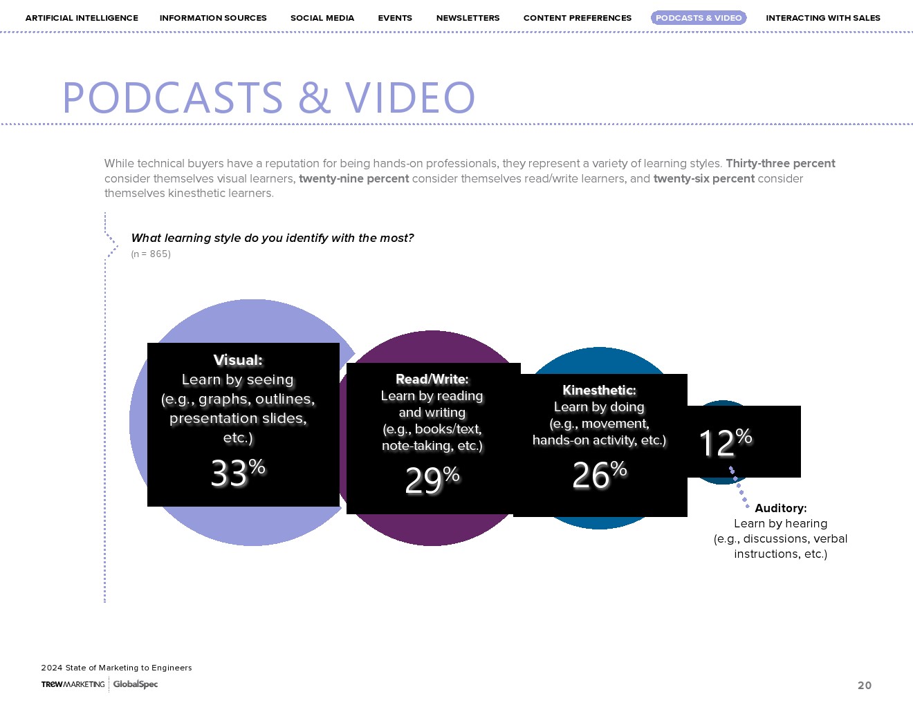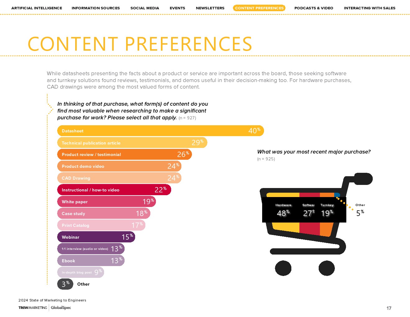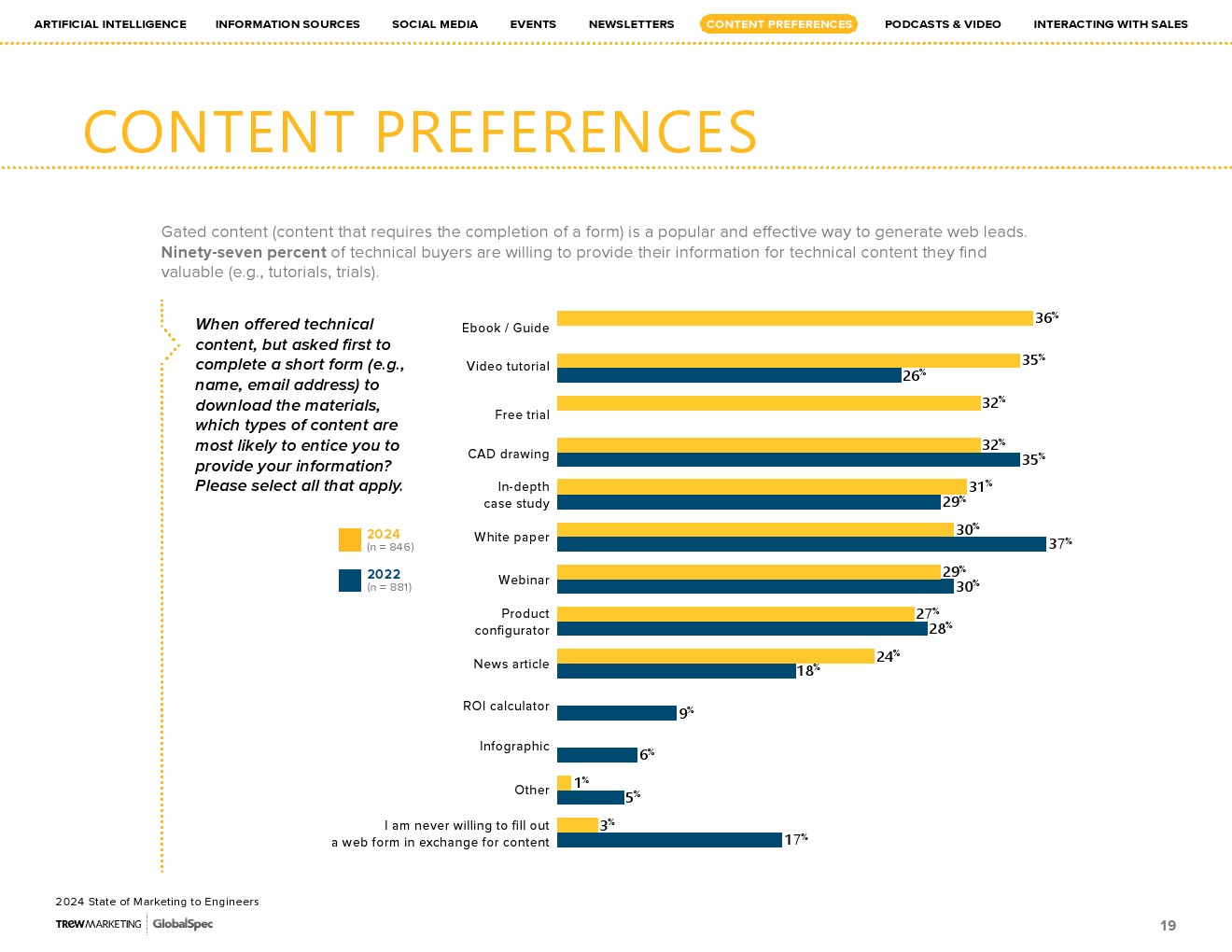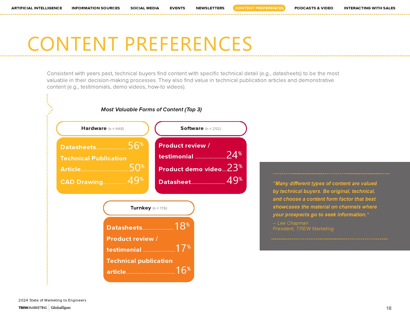 尽管如此,对于技术买家来说,视频并不是最有价值的内容类型,因为他们需要进行研究,以便为工作做出重大购买决策。相反,这种区别属于数据表(40%),其次是技术出版物(29%),产品评论/推荐(26%),然后是产品演示视频(24%)。