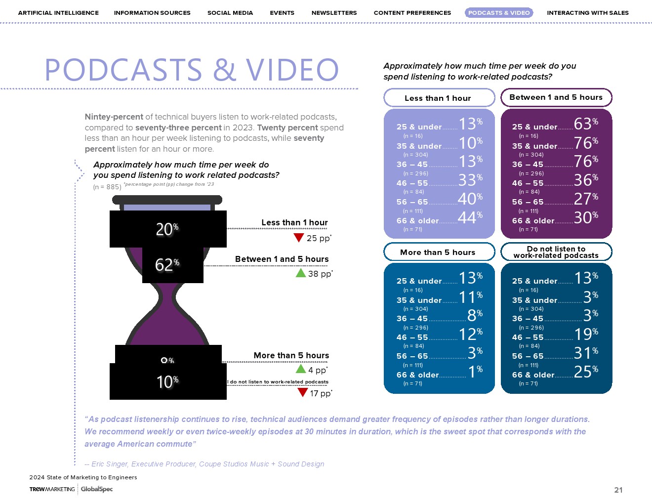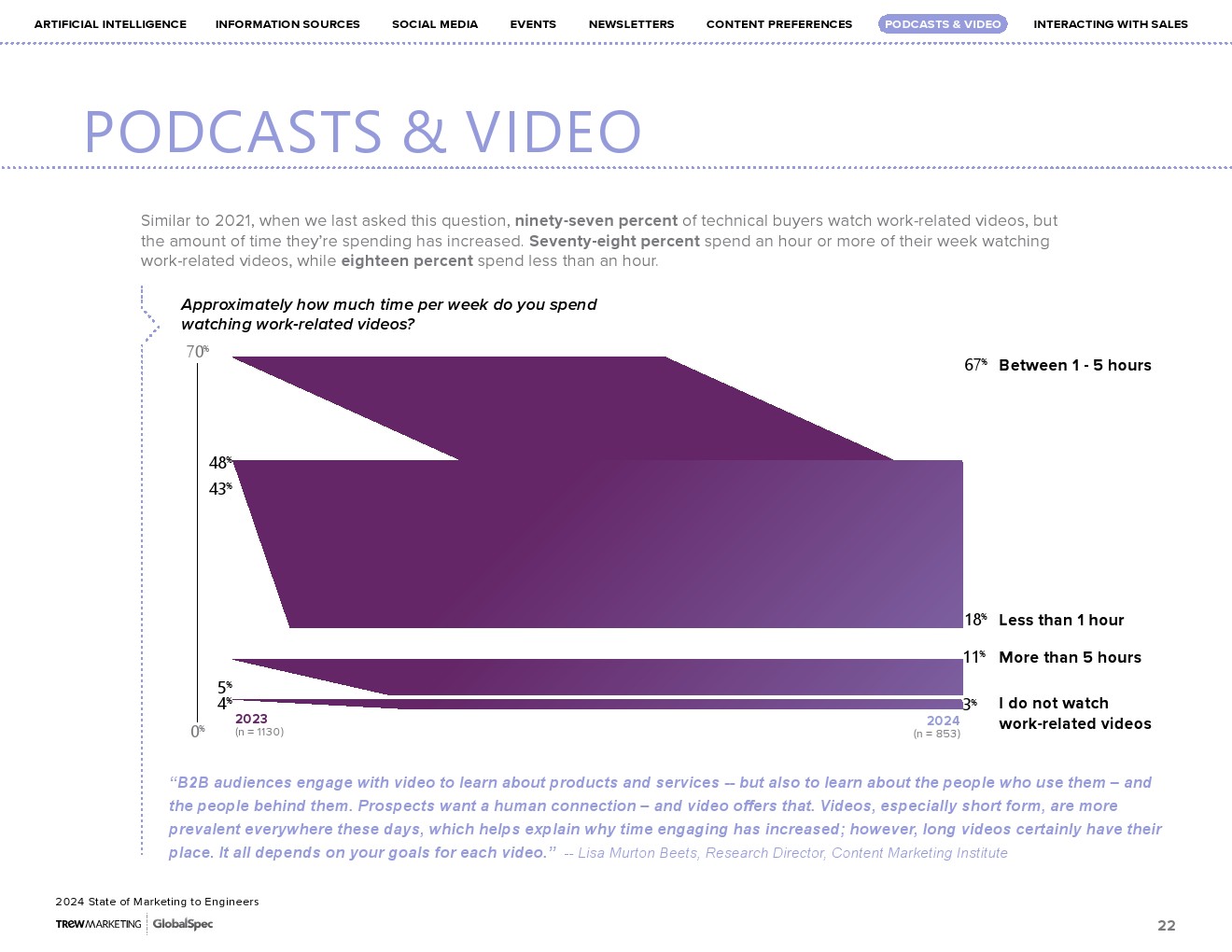 几乎所有的技术买家(97%)都观看与工作相关的视频,而且他们花在这上面的时间正在增加。今年2/3的人每周花1-5个小时观看与工作相关的视频,比去年(43%)大幅增加。此外,每周花费超过5小时观看此类视频的受访者比例增加了一倍多,从5%增长到11%。