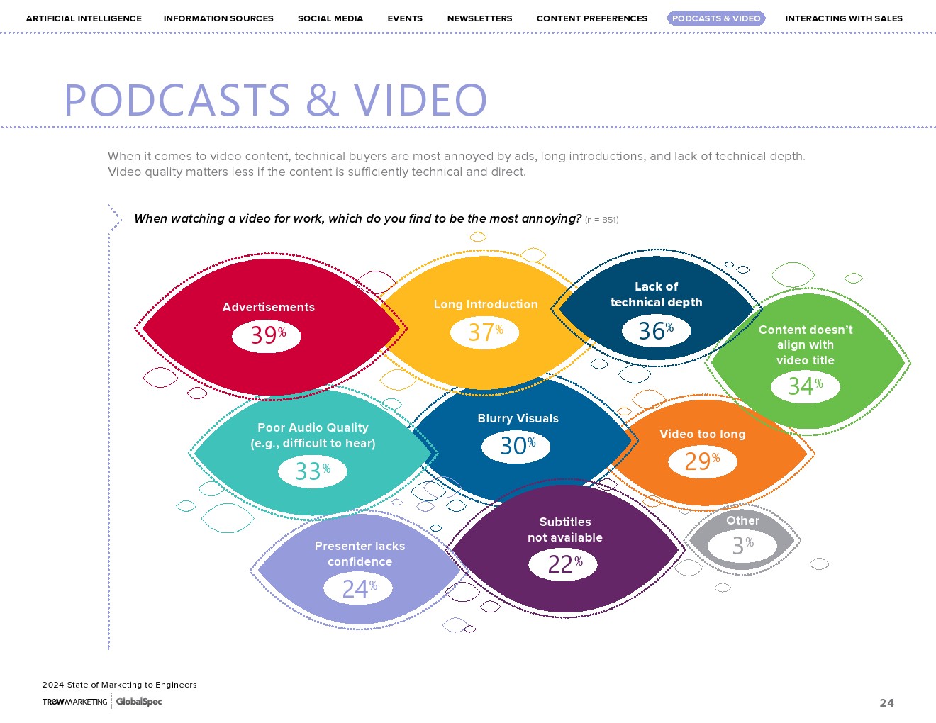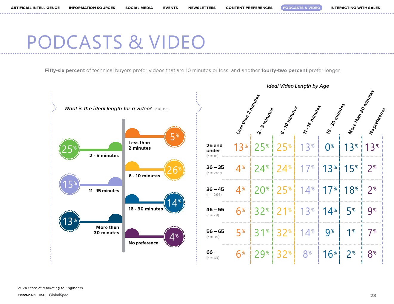 至于视频本身,受访者最倾向于认为6-10分钟(26%)和2-5分钟(25%)是理想的长度。视频中最令人讨厌的是广告(39%)、冗长的介绍(37%)、缺乏技术深度(36%)以及与视频标题不一致的内容(34%)。