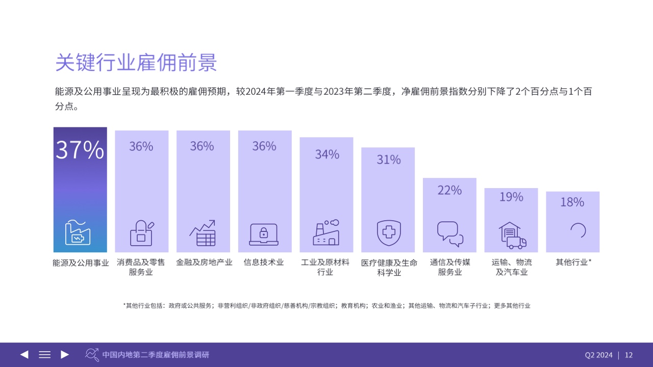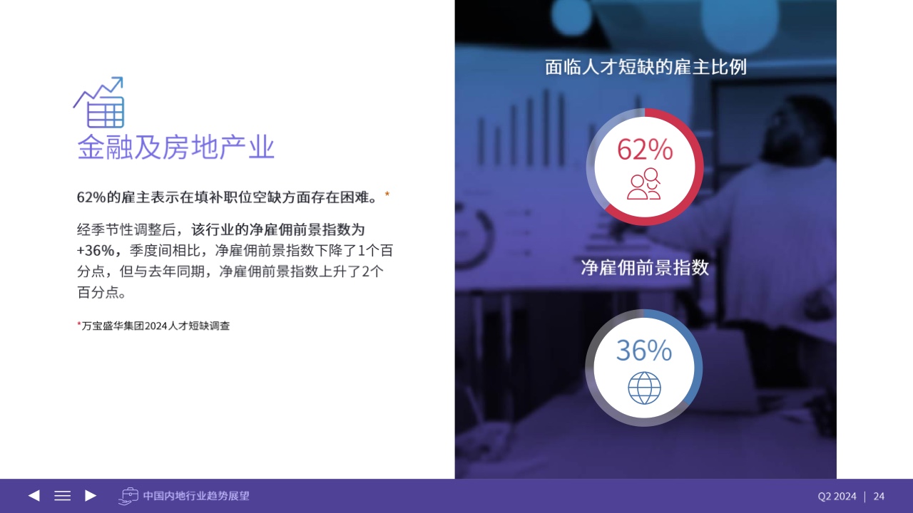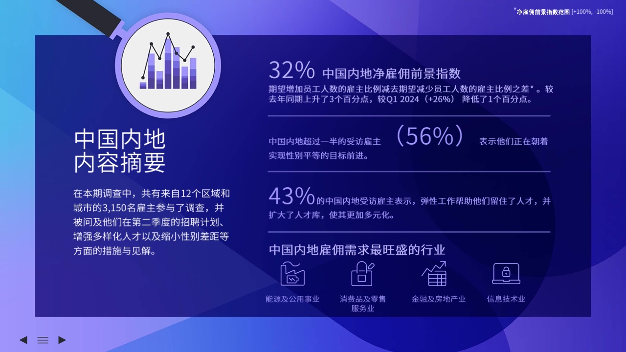 32%中国内地净雇佣前景指数期望增加员工人数的雇主比例减去期望减少员工人数的雇主比例之差。较 去年同期上升了3个百分点,较Q1 2024(+26%)降低了1个百分点。