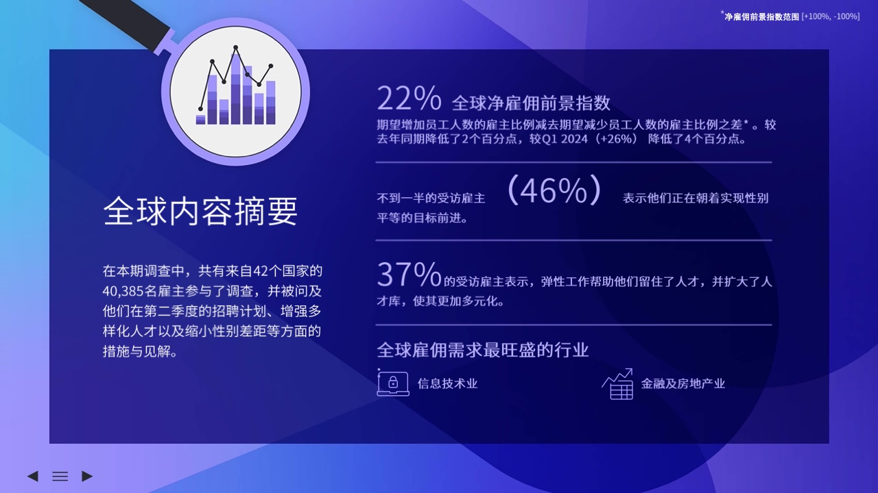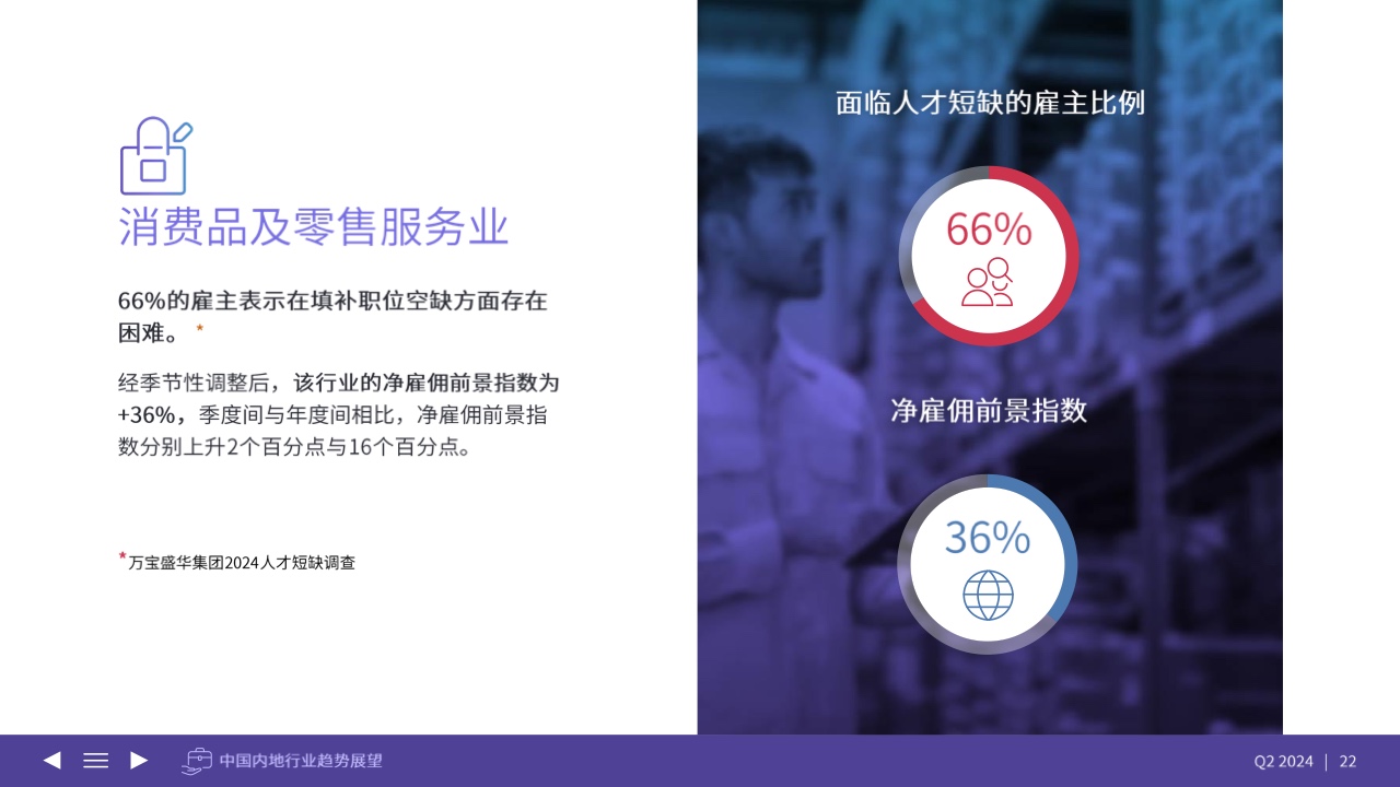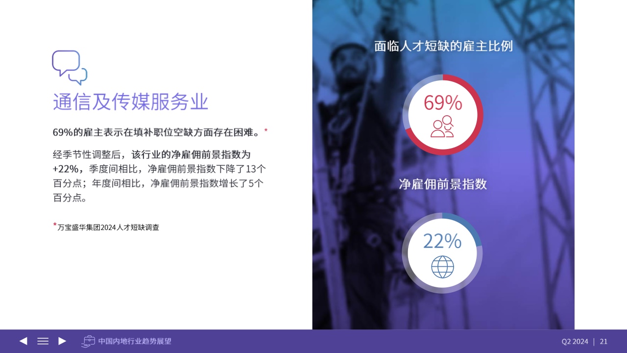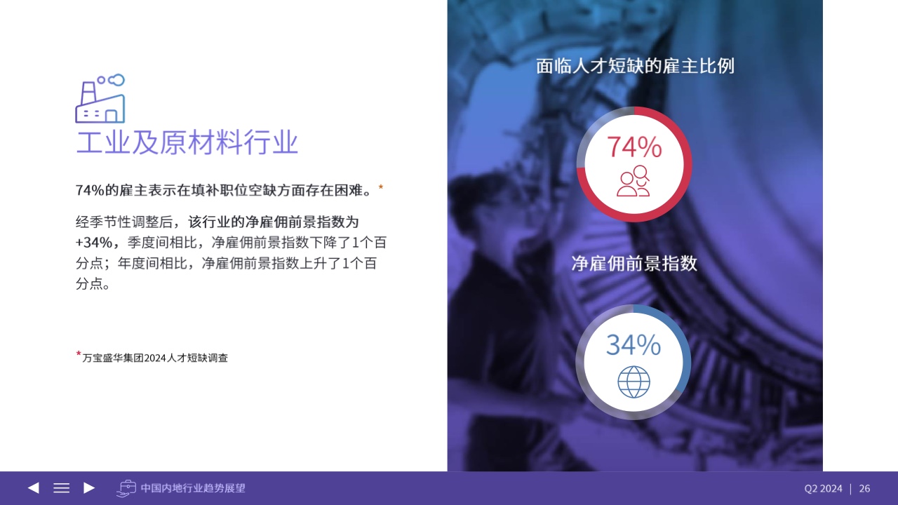 32%中国内地净雇佣前景指数期望增加员工人数的雇主比例减去期望减少员工人数的雇主比例之差。较 去年同期上升了3个百分点,较Q1 2024(+26%)降低了1个百分点。