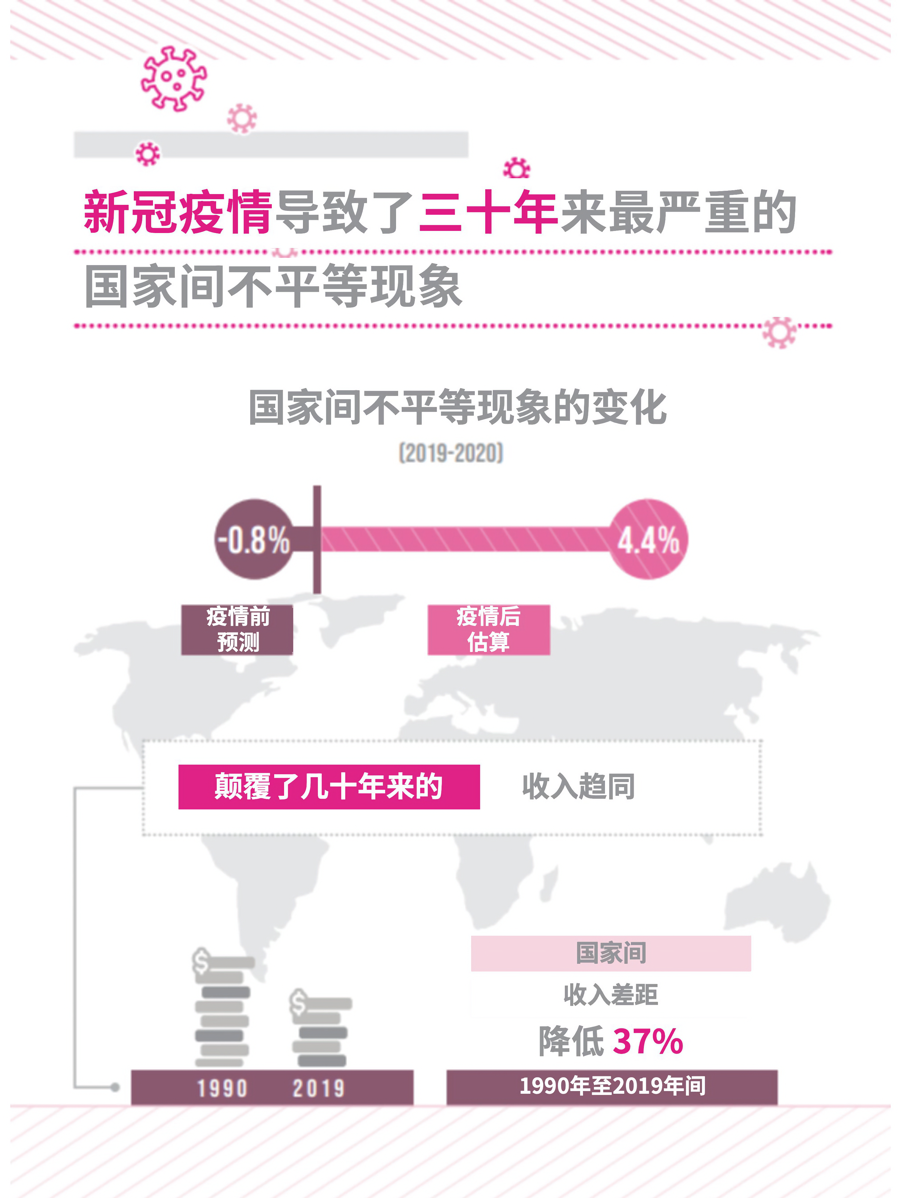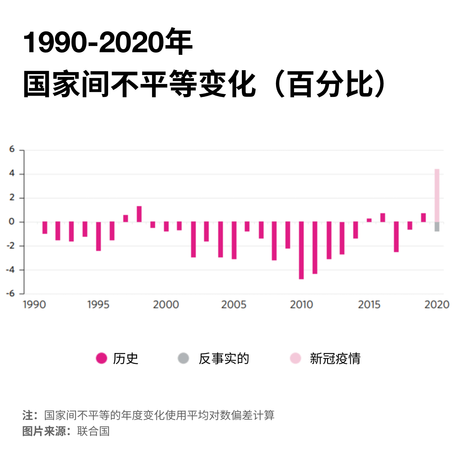 然而,这一趋势在2020年发生了逆转,导致国家间收入不平等出现三十年来最大幅度的上升。根据现有数据,联合国估计,仅2019年至2020年间,不平等现象就上升了4.4%。