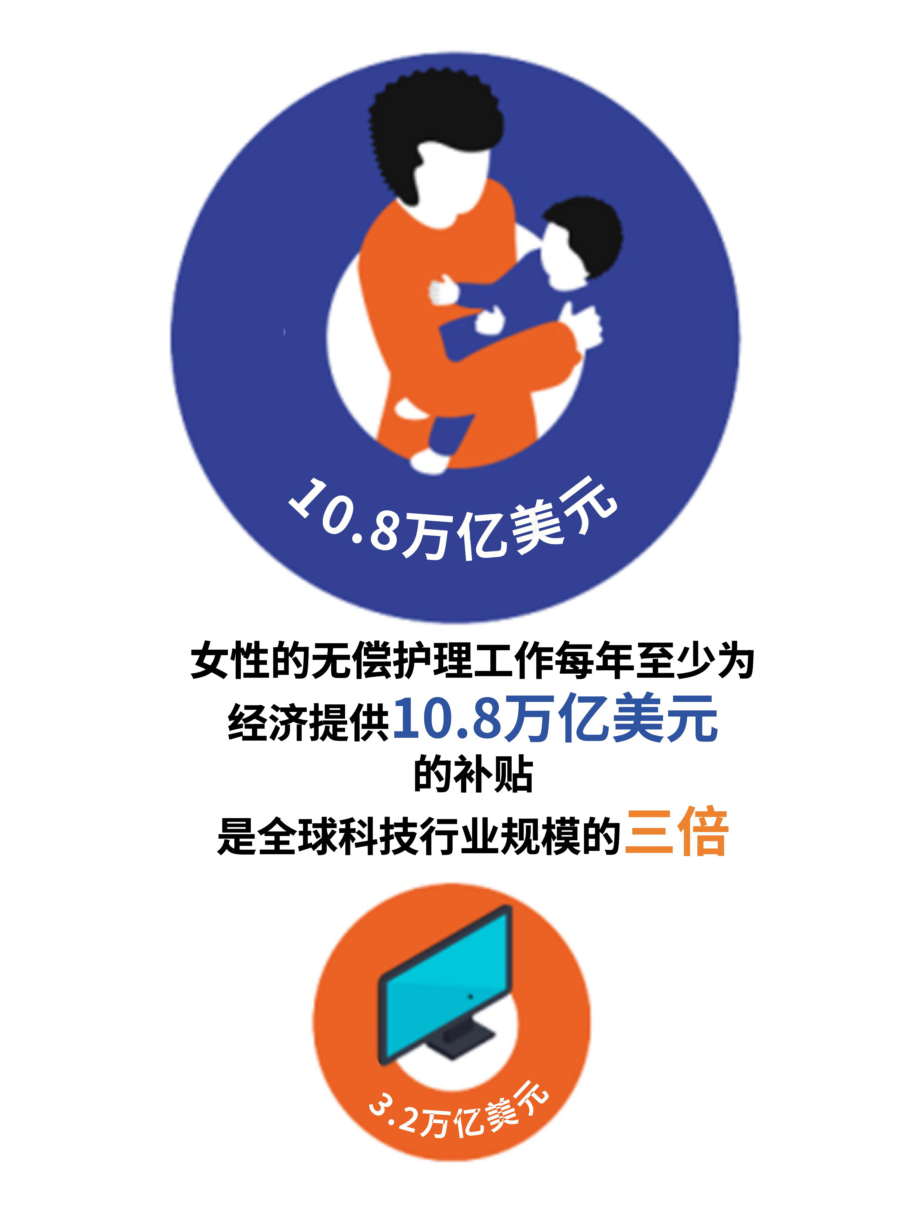 除此之外,妇女从事的护理和家务工作中大部分是无偿的。乐施会表示,仅女性在护理方面的无偿工作,每年就能给经济带来10.8万亿美元的价值,是全球科技行业规模的三倍。