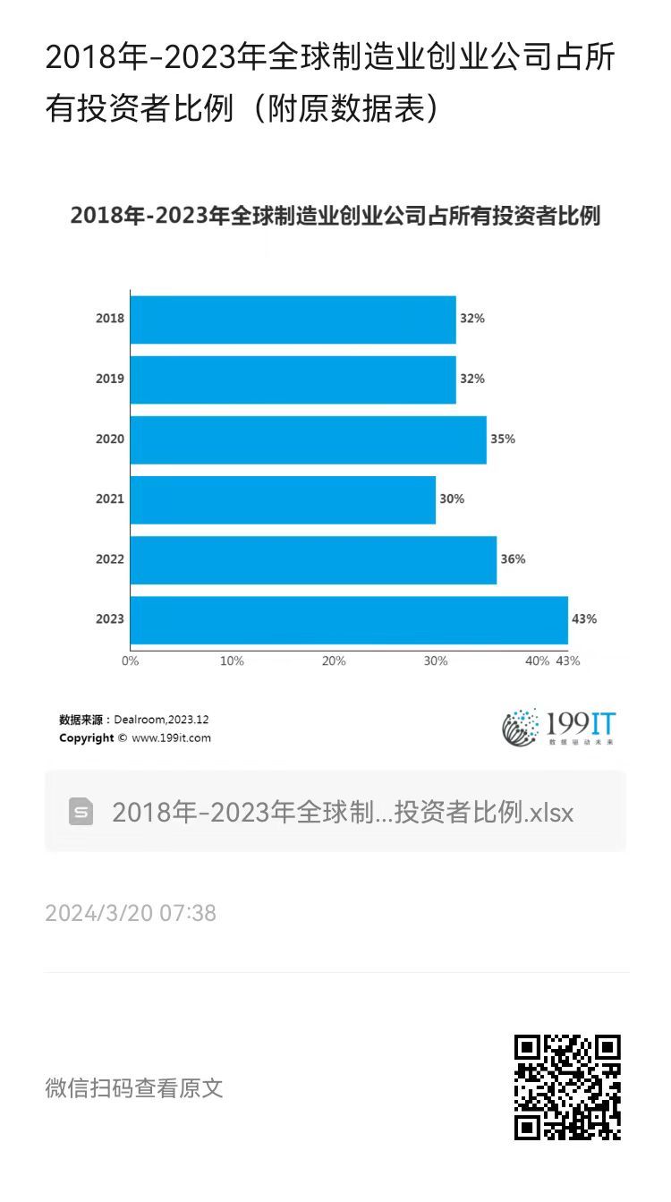 2018年-2023年全球制造业创业公司占所有投资者比例(附原数据表) ​​​