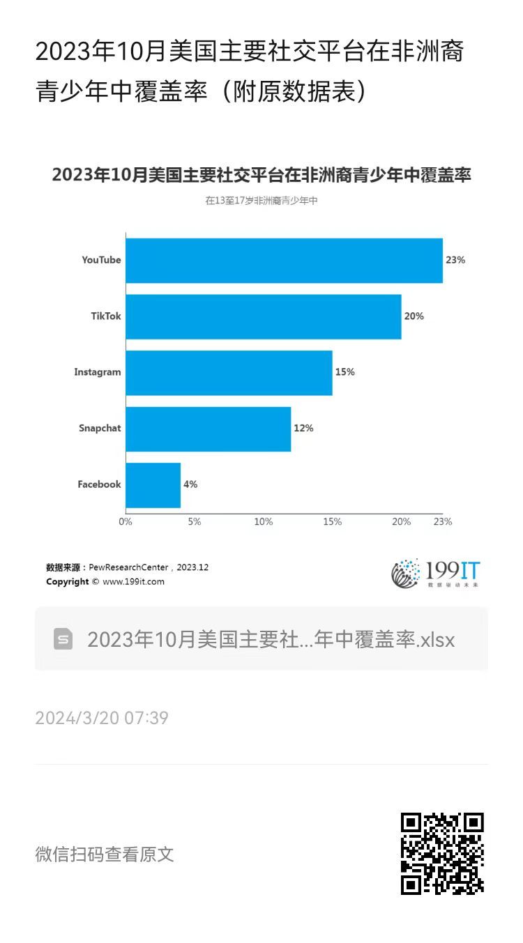 2023年10月美国主要社交平台在非洲裔青少年中覆盖率(附原数据表) 更多阅读:2023年全球营销人员使用社交平台比例(附原数据表) 2025年美国主要社交平台总收入预测(附原数据表) 2023年10月美国主要社交平台在13至17岁青少年中覆盖率(附原数据表) 2023年10月美国主要社交平台在13至17岁女孩中覆盖率(附原数据表) 23年10月美国主要社交平台在13至17岁白人青少年中覆盖率(附原数据表) 2023年10月美国主要社交平台在13至17岁男孩中覆盖率(附原数据表) 2023年10月美国主要社交平台在13至17岁女孩中覆盖率(附原数据表) eMarketer:2016年Q1社交平台移动视频广告支出增长26%YPulse:Instagram仍然是Z世代和千禧一代最喜欢的社交平台千趣GKURC:Z世代更喜欢哪一类社交平台?Conviva:2021年流媒体报告YouGov:YouTube和TikTok用户行为分析Aol Platforms:调查显示YouTube是广告效果最好的社交平台Rakuten:2019意见领袖营销报告社交平台的现状及发展方向