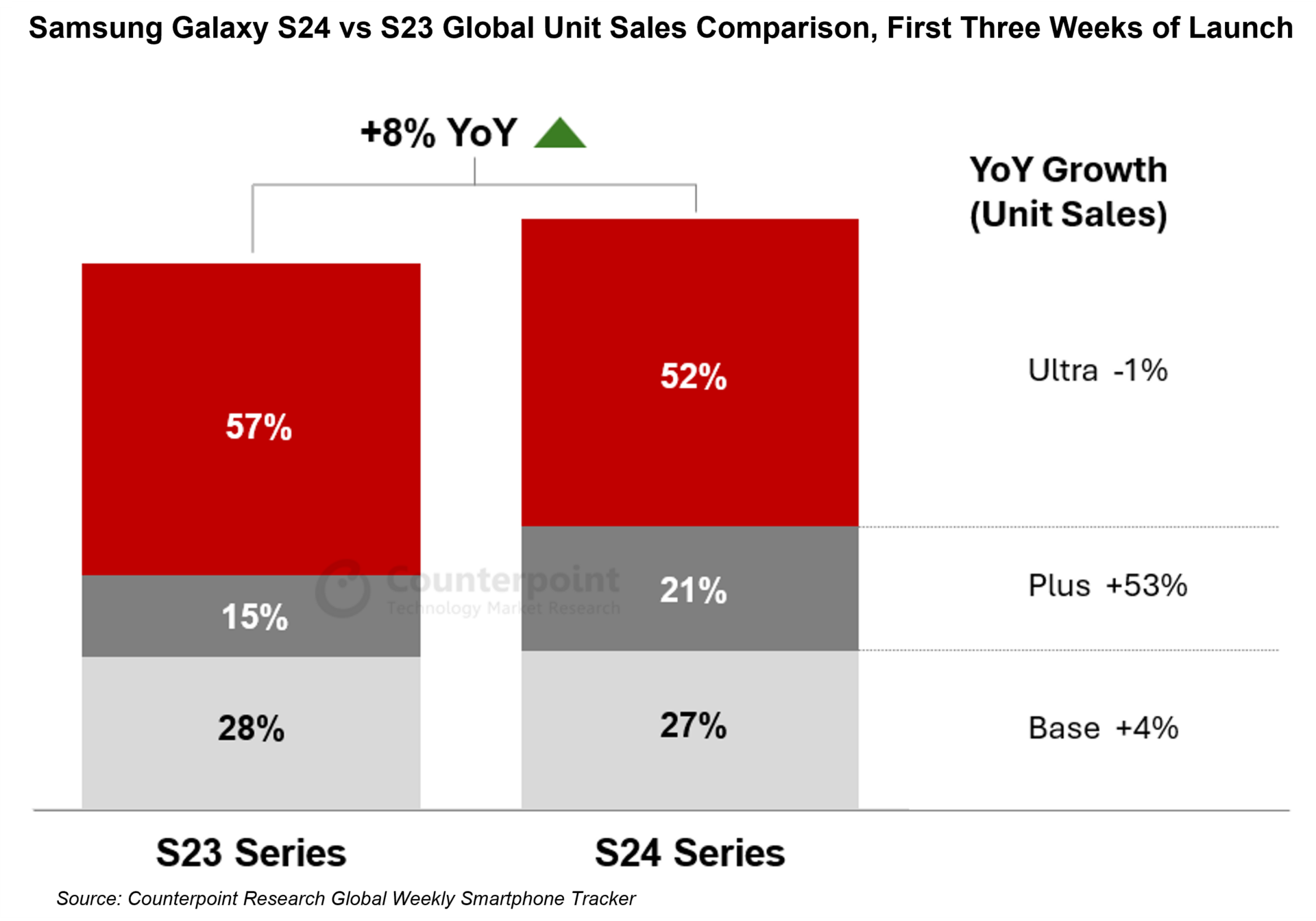 根据Counterpoint最新的数据,在上市的前三周,三星Galaxy S24系列手机的全球销量同比增长了8%。与S24 Plus相比,S24和S24 Ultra的需求保持相对平稳,S24 Plus同比增长52%,占总销量的1/5以上。