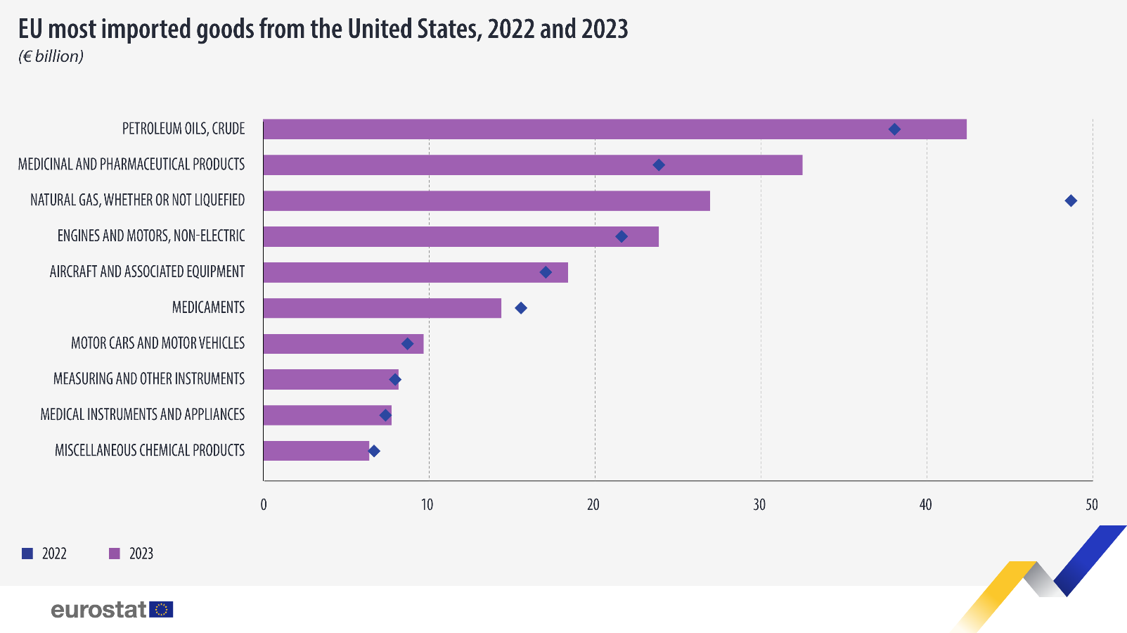 2023年从美国进口的最多的商品是原油,价值424亿欧元,比2022年(380亿欧元)增长11.4%。