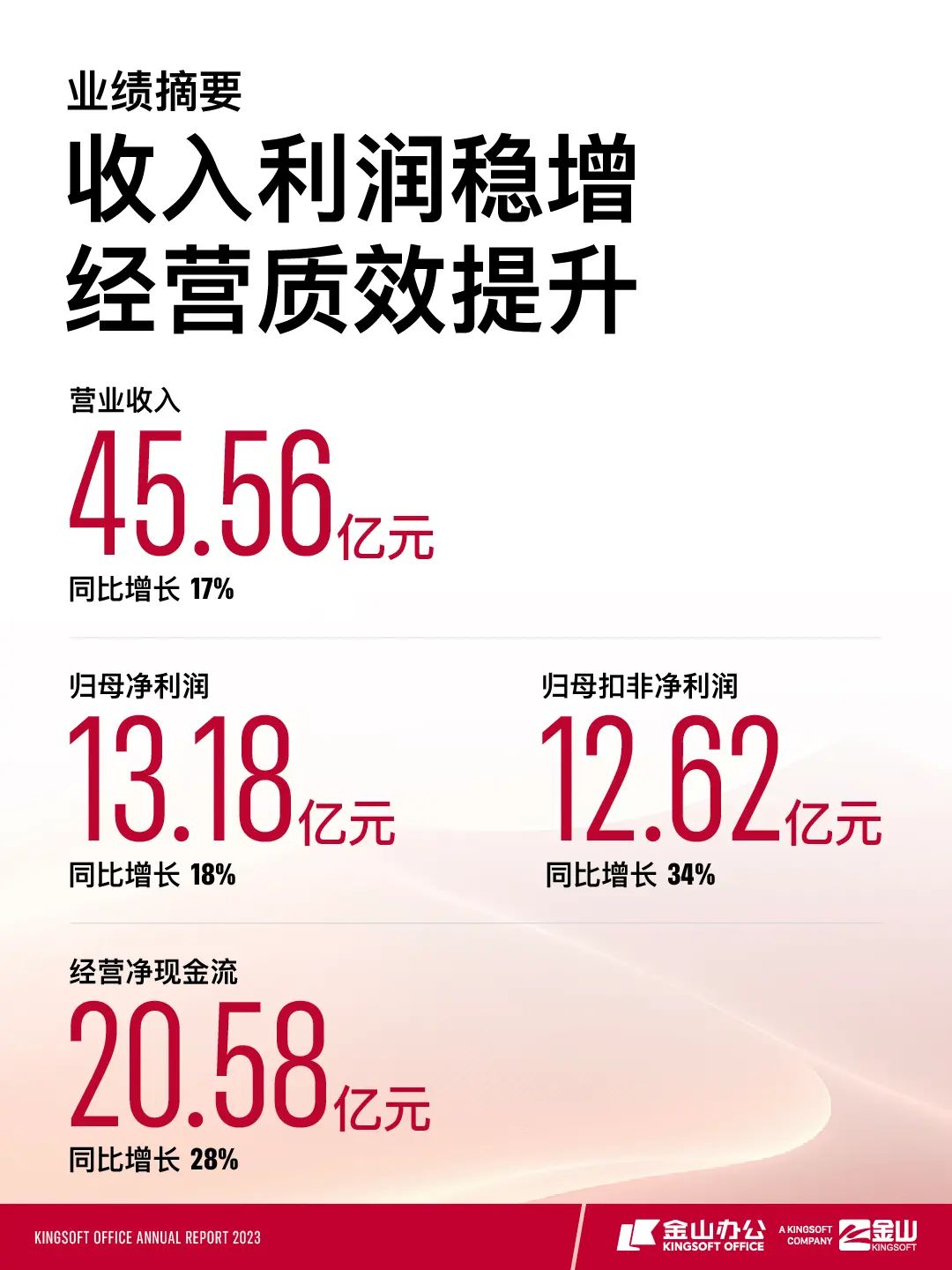 近日,金山办公正式公布了2023年报数据。2023年,金山办公营收与净利润全面增长,营业收入45.56亿元,同比增长17.27%;归属于母公司所有者净利润13.18亿元,同比增长17.92%;归属于母公司所有者扣除非经常性损益净利润12.62亿元,同比增长34.45%,盈利能力持续提升。
