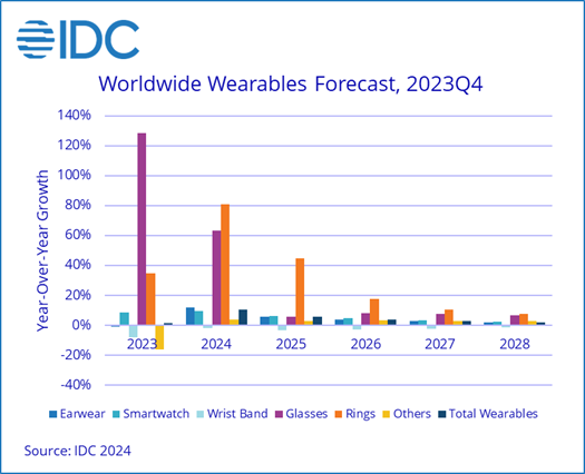 虽然市场在第四季度略有下滑,但全球可穿戴设备的出货量在2023年全年增长了1.7%。在各种类型的设备中,可听设备全年同比下降0.8%,占整个可穿戴设备市场的61.3%。创新的缓慢步伐和采用的快速步伐很快导致这类产品更多地依赖于替代品,而不是新买家。与此同时,由于印度和中国在供应商和消费方面领先市场,智能手表的出货量在今年增长了8.7%,继续保持增长势头。Oura和Ultrahuman等公司生产的智能戒指销量增长了34.9%;由于亚马逊和Meta推出了新产品,无屏眼镜销量增长了128.2%。