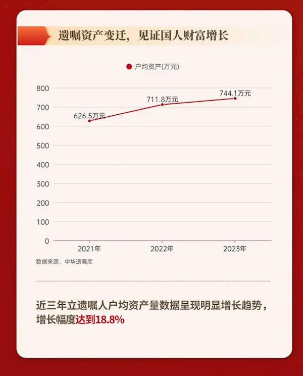 近三年来,立遗嘱人户均资产量呈现明显增长趋势。从2021年的626.5万元增长至2023年的744.1万元,增长幅度达到了18.8%。