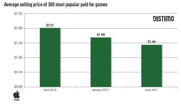 Distimo的监测数据显示,前300名游戏的平均售价从 2010年6月的2.01美元下滑到2011年6月的1.44美元,也就是说即使是付费游戏也绝大部分是1.99美元以下的低价游戏。