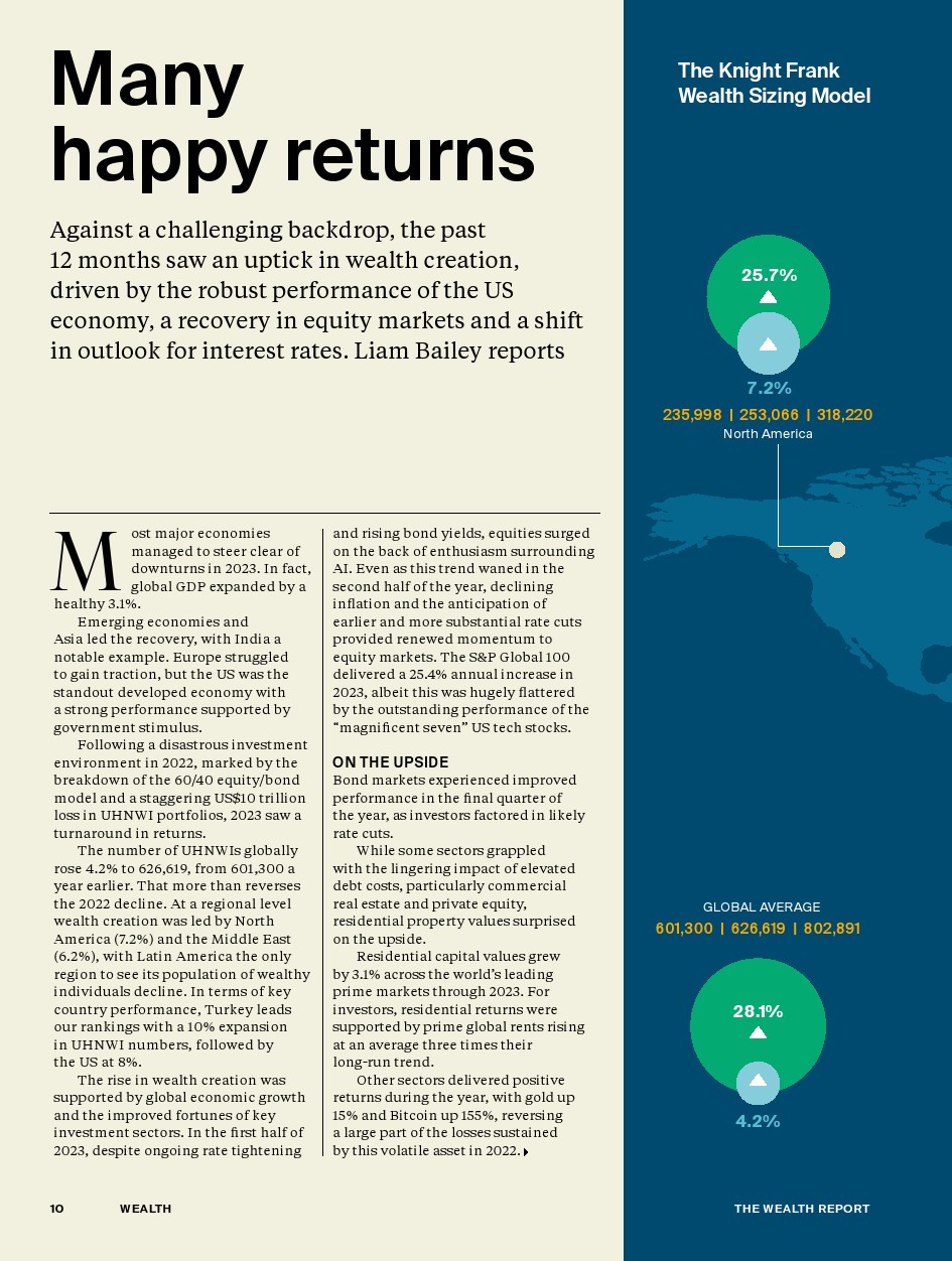 利率前景的转变、美国经济的强劲表现以及股市的急剧上涨,都有助于全球财富的创造。截至2023年底,超高净值人士的数量比一年前增长了4.2%,每天都有近70名非常富有的投资者诞生,使全球超高净值人士总数略高于626600人。增长最快的是北美(+7.2%)和中东(+6.2%)。