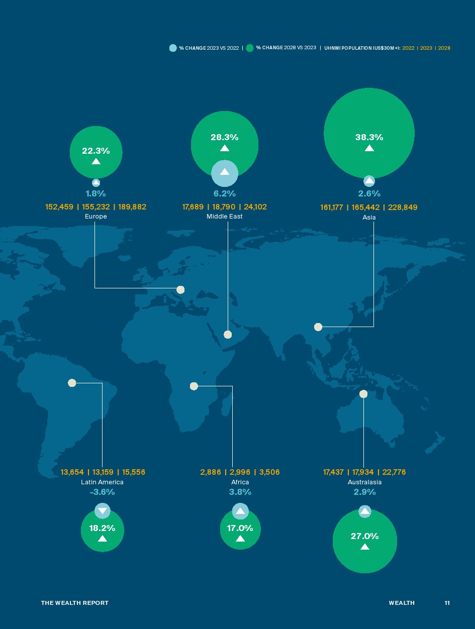 截至2028年的五年内,全球富人人数将增长28.1%。我们的模型指出,亚洲表现强劲,尤其是印度(50%)和中国大陆(47%)的高增长。