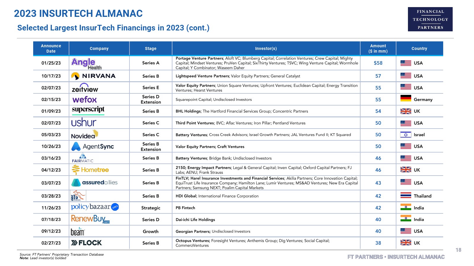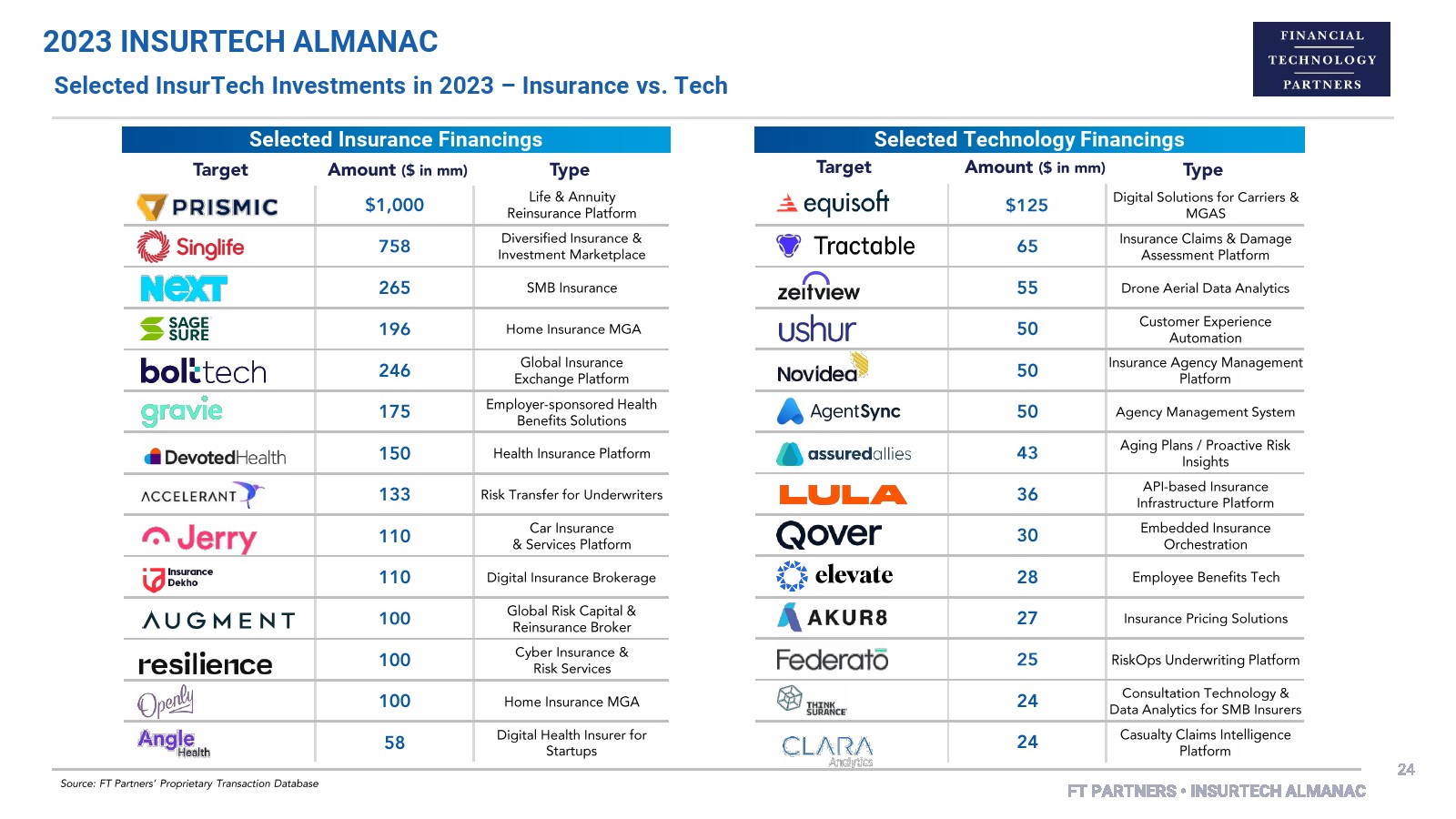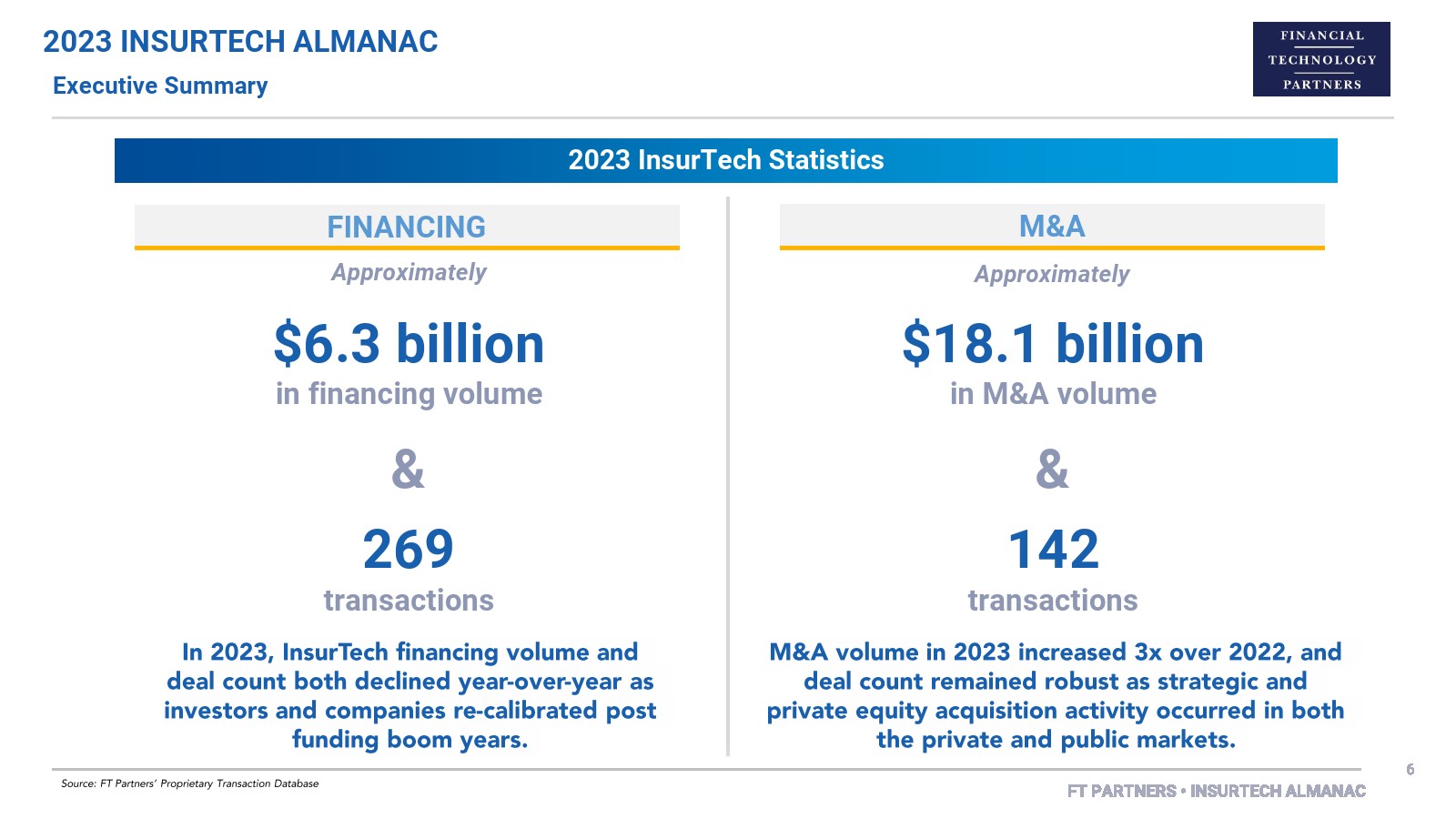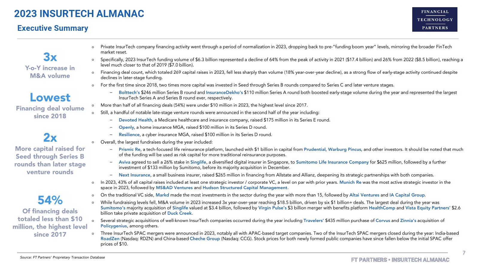 私营保险科技公司的融资活动在2023年经历了一段正常化时期,回落到“融资繁荣年”之前的水平,反映了更广泛的金融科技市场重塑。