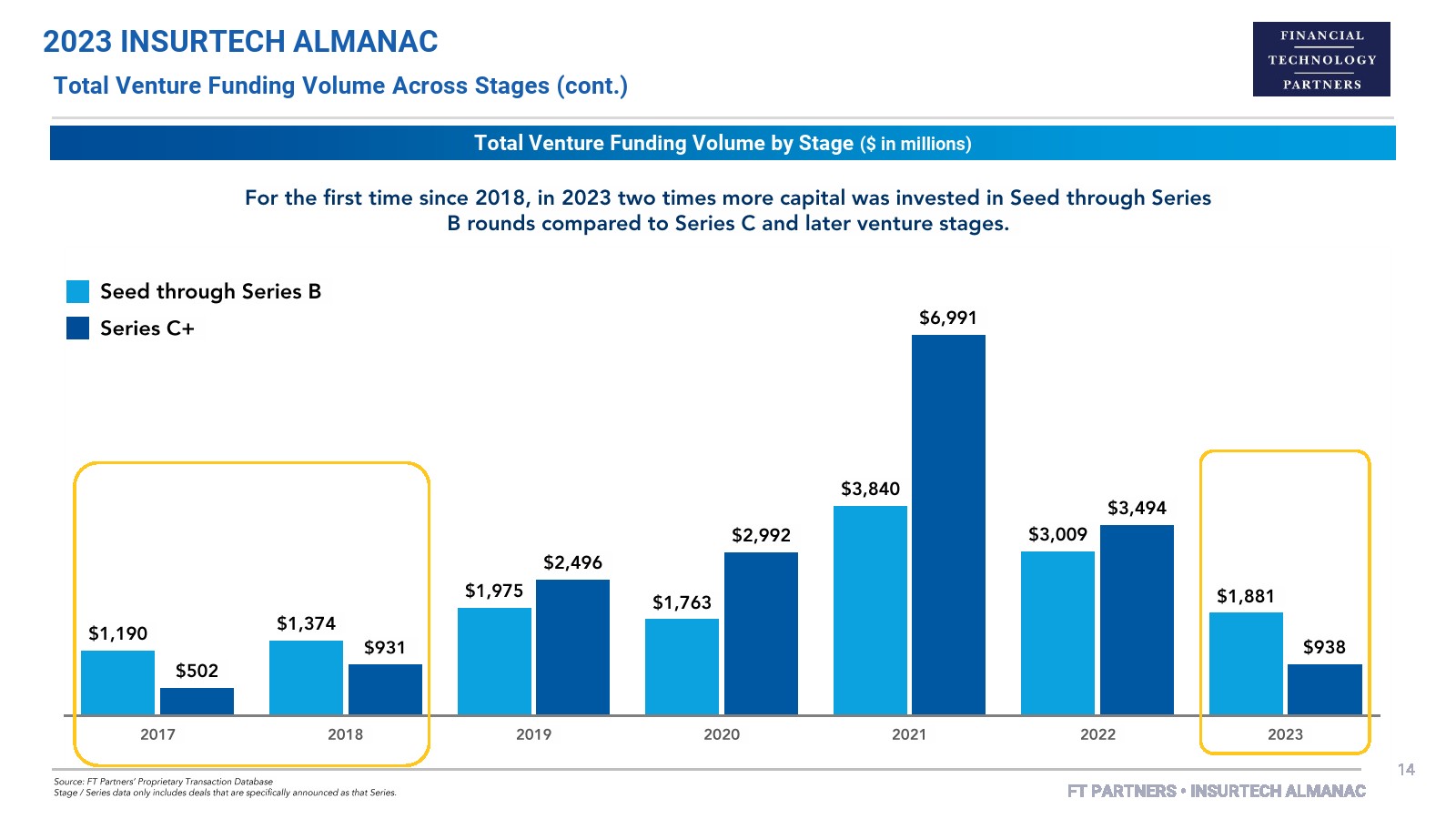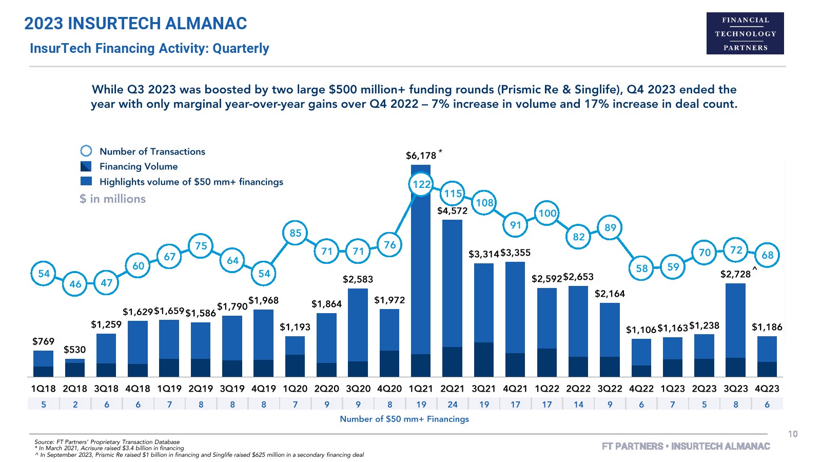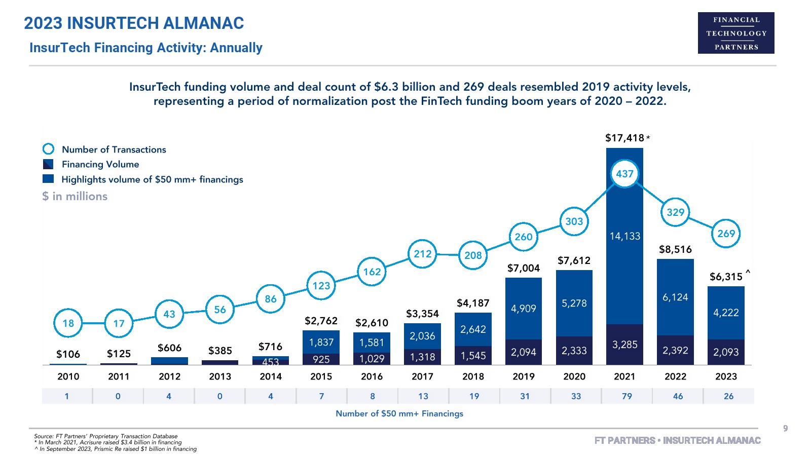 私营保险科技公司的融资活动在2023年经历了一段正常化时期,回落到“融资繁荣年”之前的水平,反映了更广泛的金融科技市场重塑。