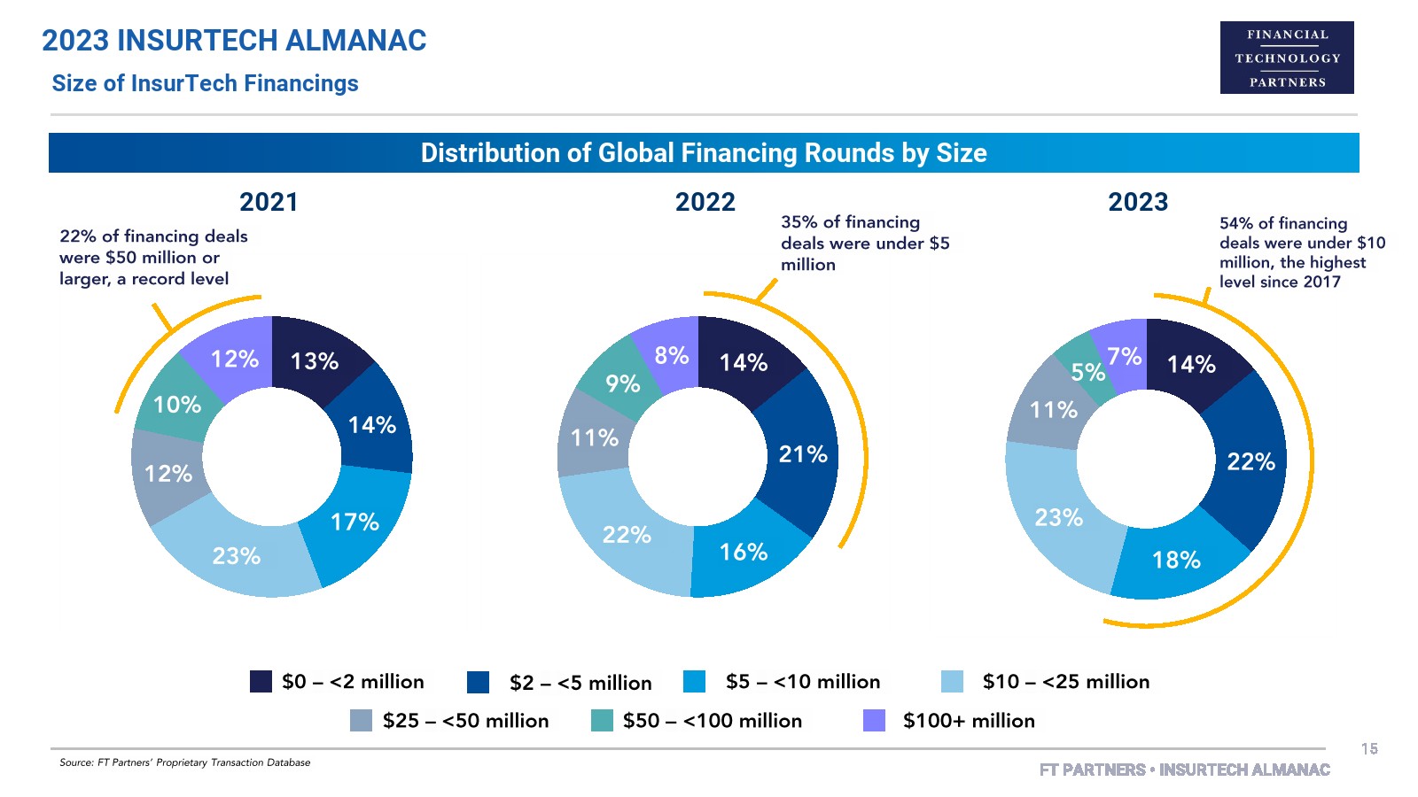2023年,超过一半的融资交易(54%)低于1000万美元,这是自2017年以来的最高水平。