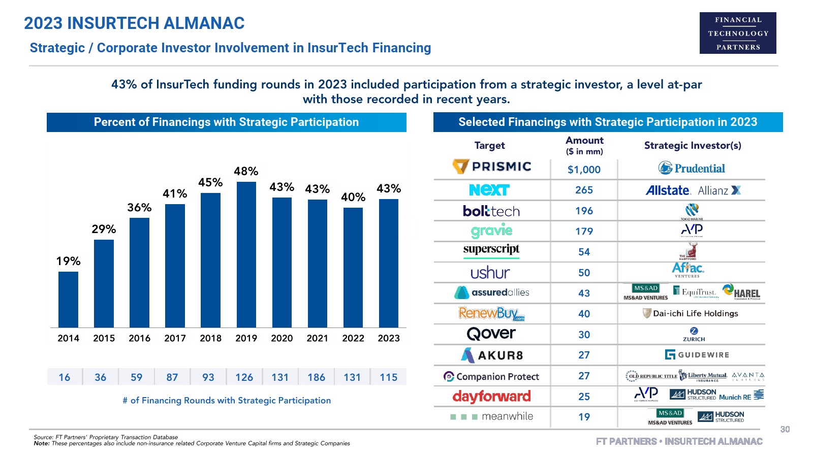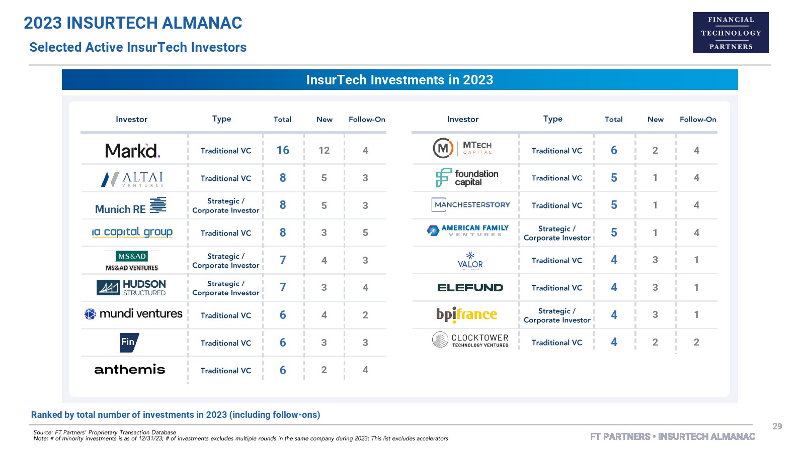 2023年,43%的融资至少包括一位战略投资者/企业风投,这一水平与前几年持平。慕尼黑再保险是2023年该领域最活跃的战略投资者,其次是MS&AD Ventures和Hudson Structured Capital Management。