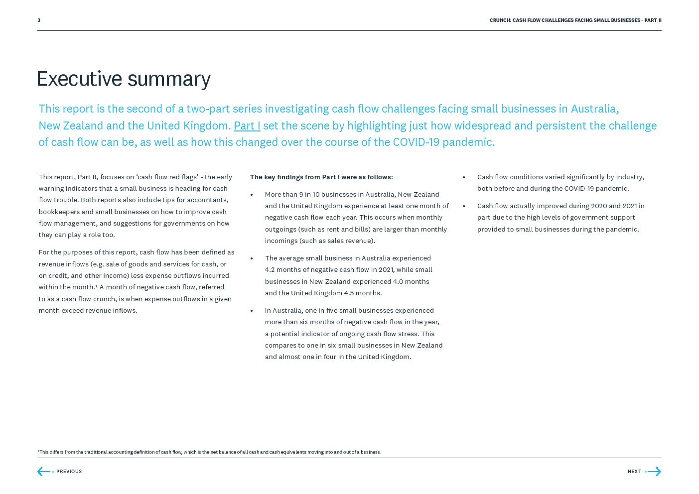 本报告主要关注“现金流危险信号”,即小企业面临现金流问题的早期预警指标。这两份报告还包括对会计师、簿记员和小企业如何改善现金流管理的建议,以及对政府如何发挥作用的建议。