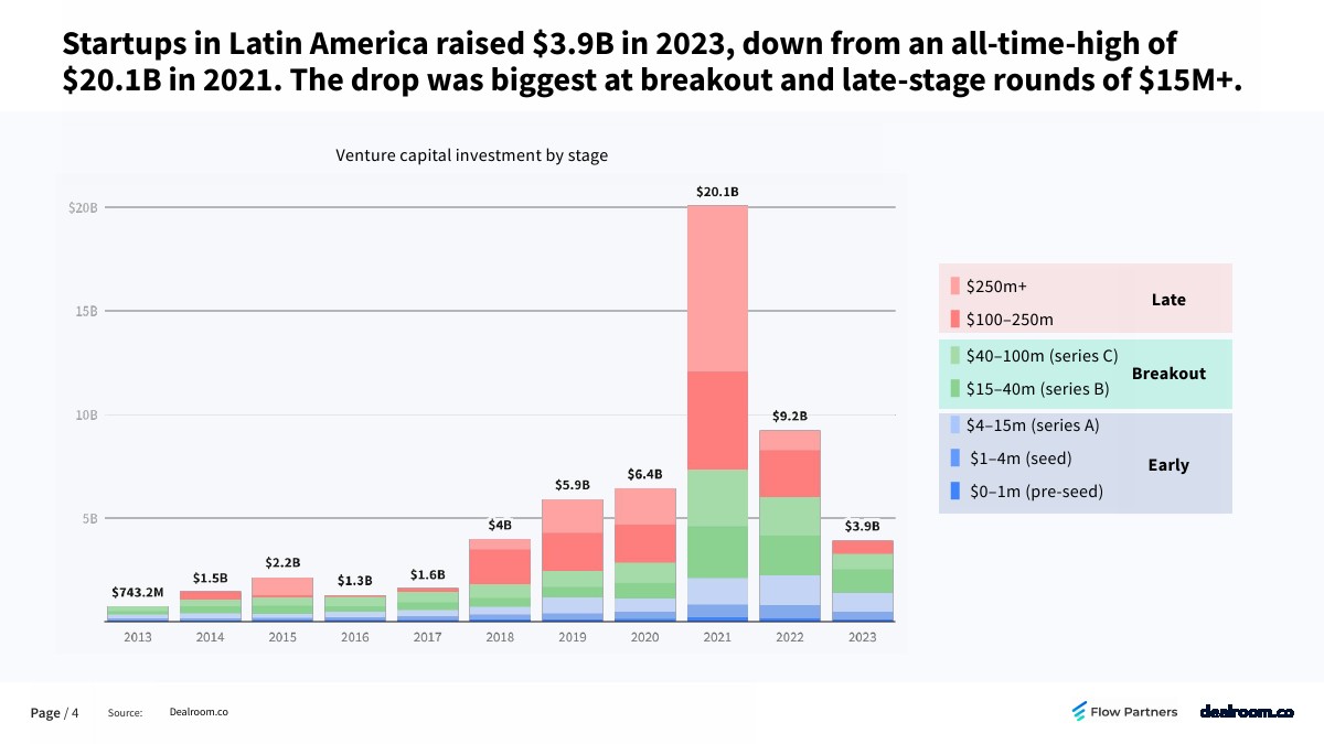 拉丁美洲的初创企业在2023年获得了39亿美元投资,低于2021年201亿美元的历史最高水平。