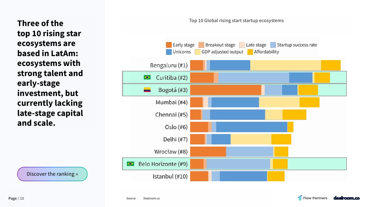 排名前十的新兴生态系统中有三个位于拉丁美洲:这些生态系统拥有强大的人才和早期投资,但目前缺乏后期资本和规模。