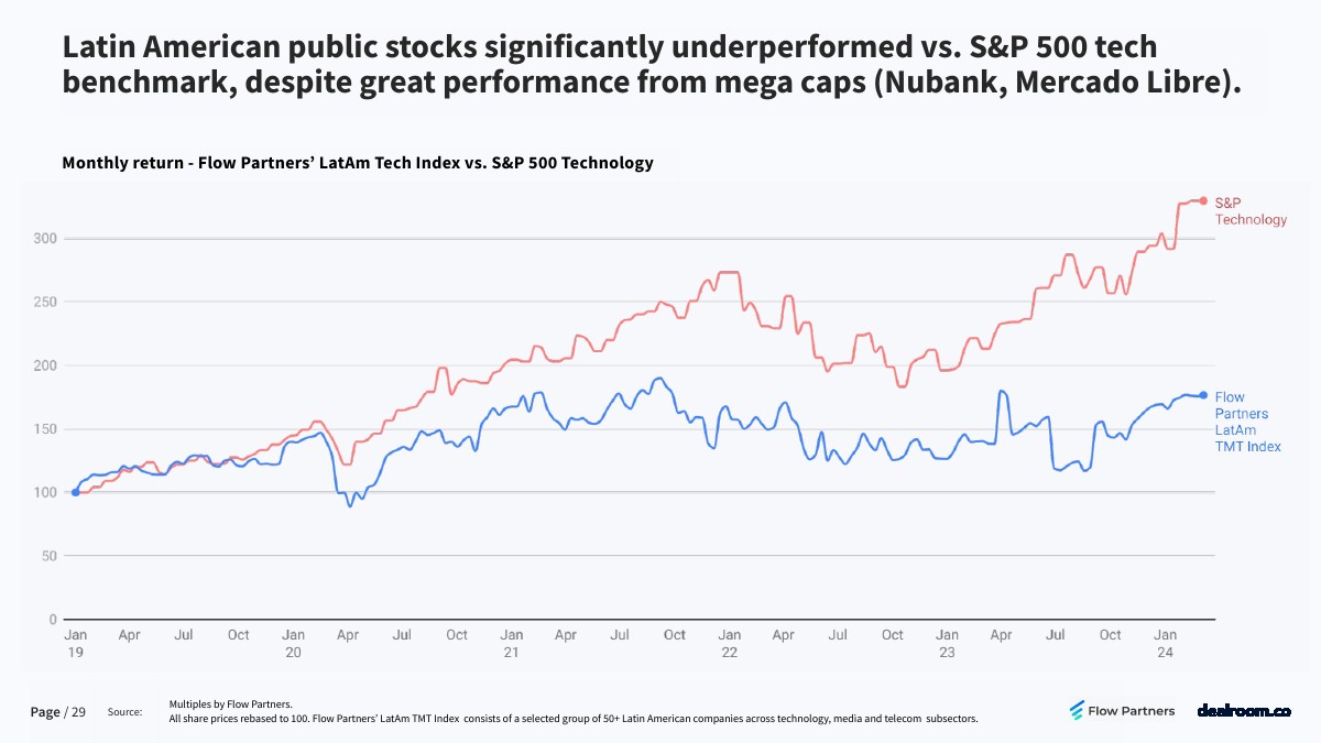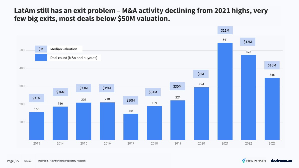 拉美仍存在投资退出问题,并购活动从2021年的高点回落,很少有大型投资退出,多数交易估值低于5000万美元。