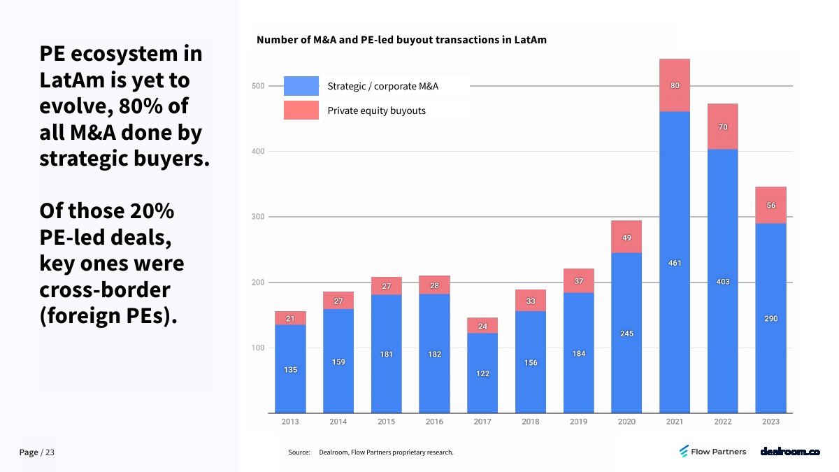 拉丁美洲的私募股权生态系统尚未发展,80%的并购是由战略买家完成的。