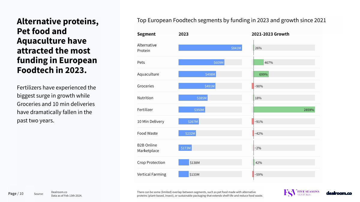 2023年,替代蛋白质、宠物食品和水产养殖吸引了欧洲食品科技领域最多的投资。