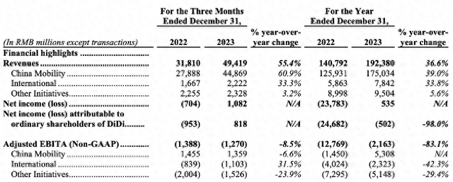 就经营指标来看,财报显示,滴滴核心平台交易量在2023年第四季度达到37.15亿单,比2022年第四季度增长64.8%。其中,中国出行业务的交易量达到29.32亿单,比2022年第四季度增长71.5%;2023年第四季度国际业务的交易量达到7.83亿单,比2022年第四季度增长43.9%。