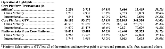 2023年全年,核心平台交易量达到134.69亿单,同比增长39.1%。其中,中国出行的交易量达到108.09亿单,同比增长39.8%;国际业务的交易量达到26.6亿单,比2022年全年增长36.2%。