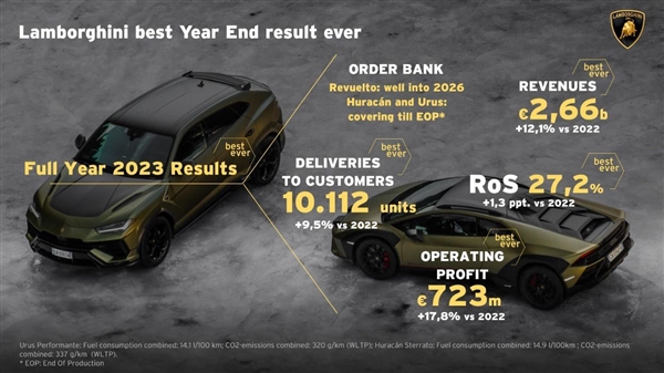 财报显示,2023年兰博基尼交付量首次超越10000台(具体为10112台),营业额达到26.6亿欧元,较2022年增长12.1%。