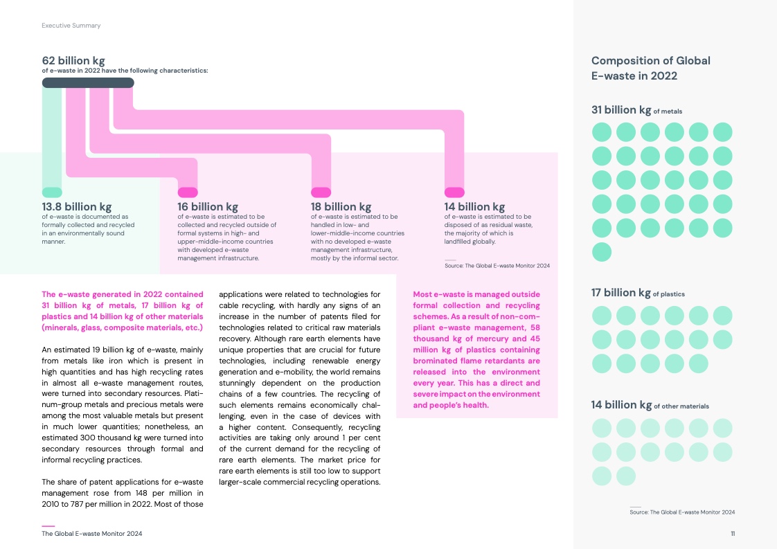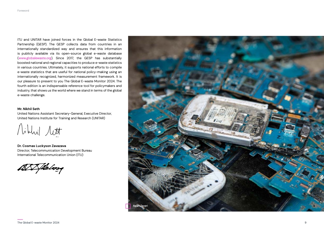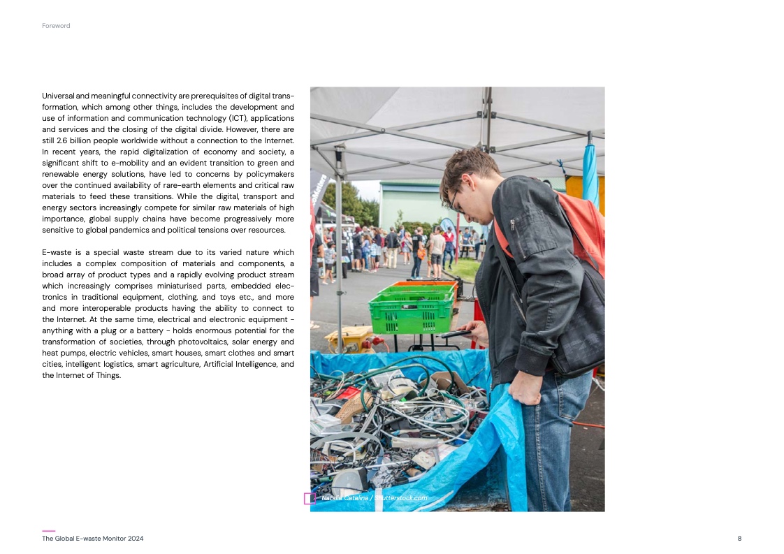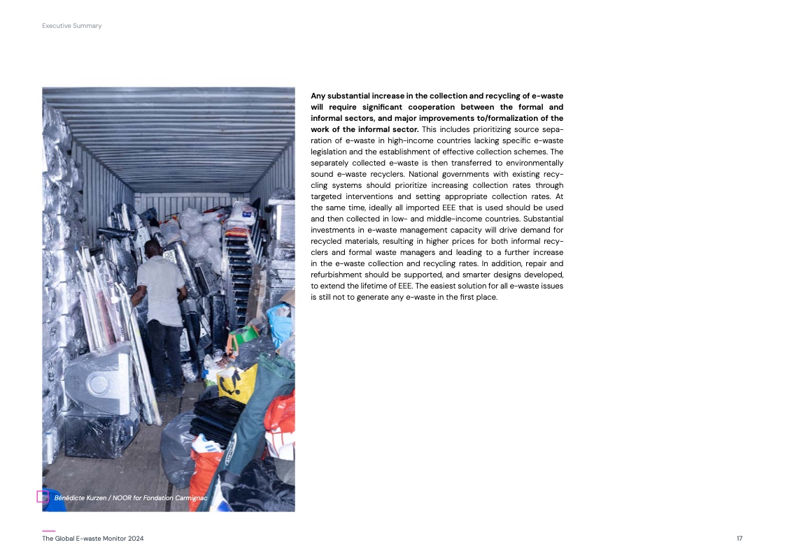 国际电联电信发展局环境和应急通信处处长格蕾(Vanessa Gray)还指出,由于电子废弃物回收不足,目前有价值910亿美元的贵重金属被白白浪费。她强调,“我们必须抓住妥善管理电子废弃物所能带来的经济和环境效益,否则人类后代的数字宏图将面临重大风险”。