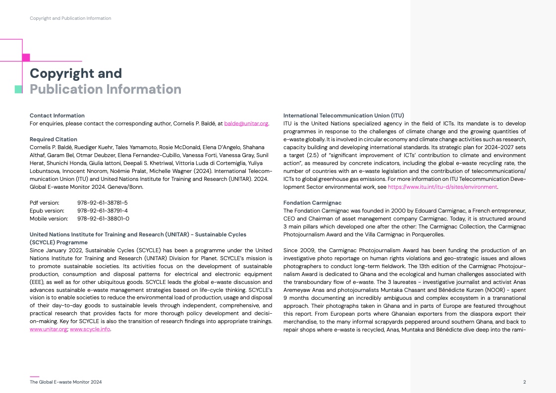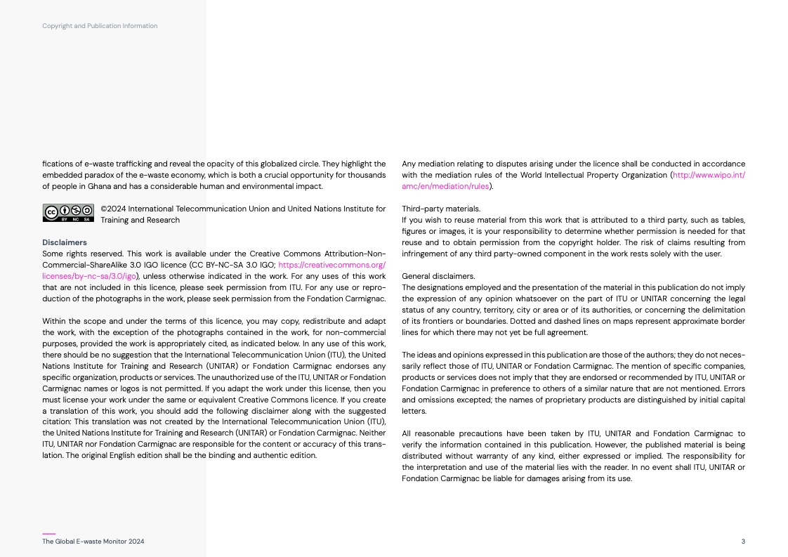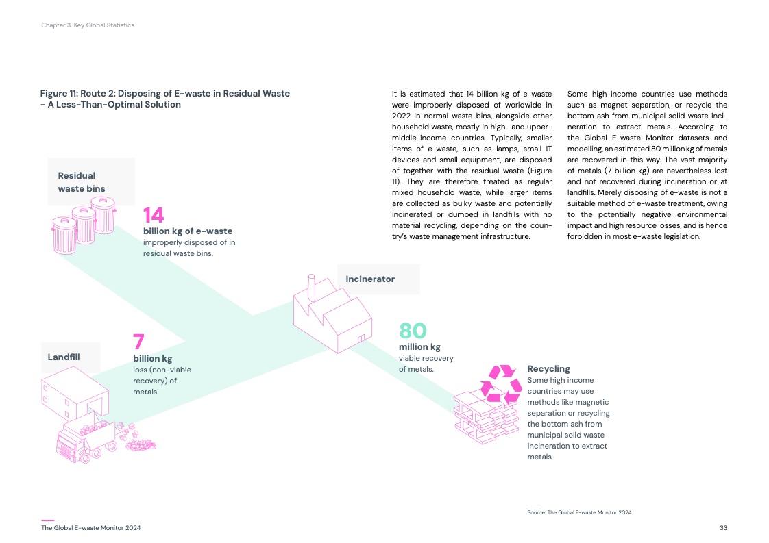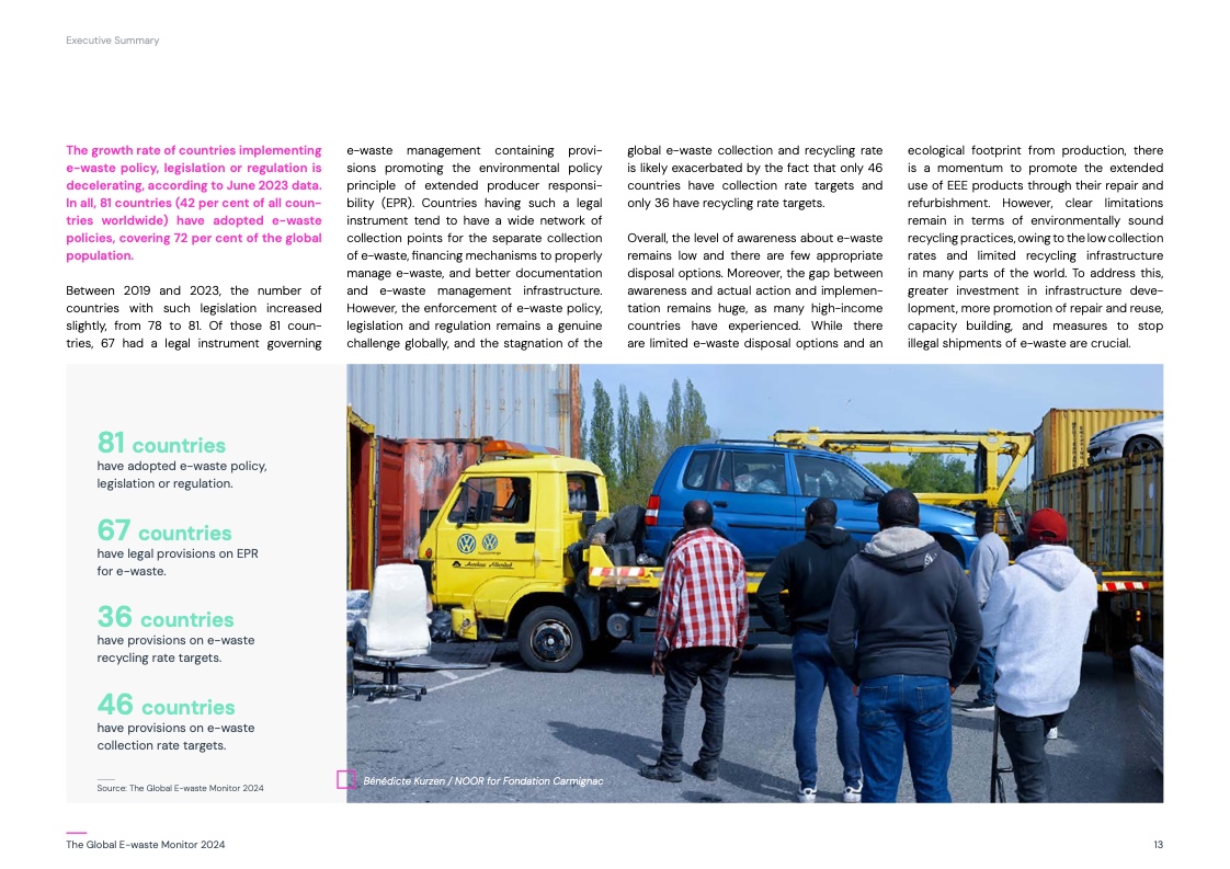 国际电联电信发展局环境和应急通信处处长格蕾(Vanessa Gray)还指出,由于电子废弃物回收不足,目前有价值910亿美元的贵重金属被白白浪费。她强调,“我们必须抓住妥善管理电子废弃物所能带来的经济和环境效益,否则人类后代的数字宏图将面临重大风险”。