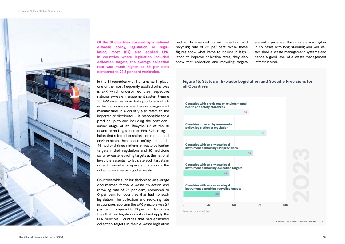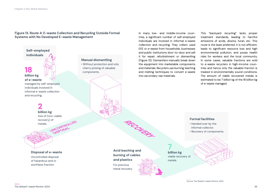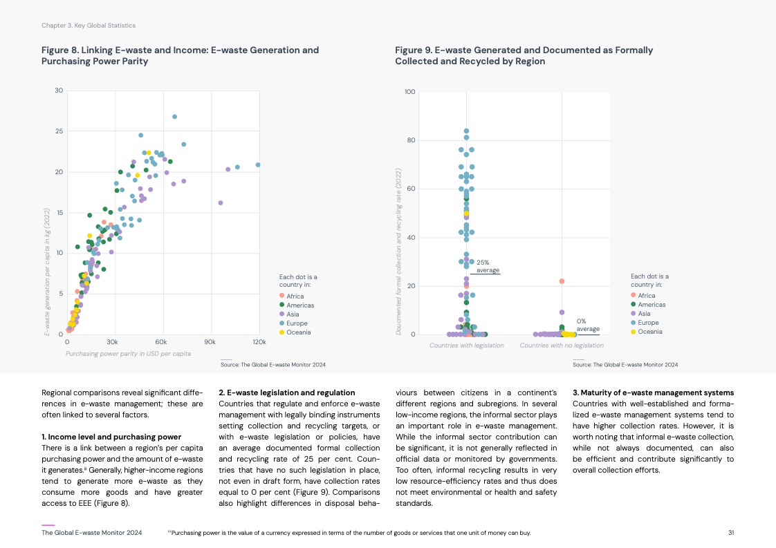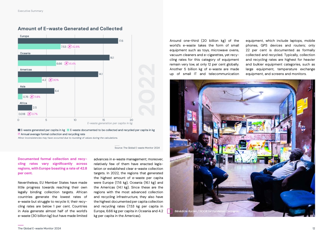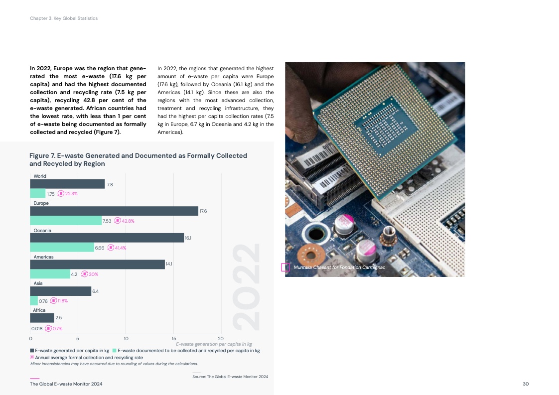 从地域上来看,欧洲对电子废弃物有正式文件记录的回收再利用率为42.8%,而非洲国家正式回收的电子废弃物比例还不到1%。此外,亚洲国家产生的电子废弃物占到全球的一半左右,但只有相对较少的国家颁布了立法或制定了明确的电子废弃物回收目标。