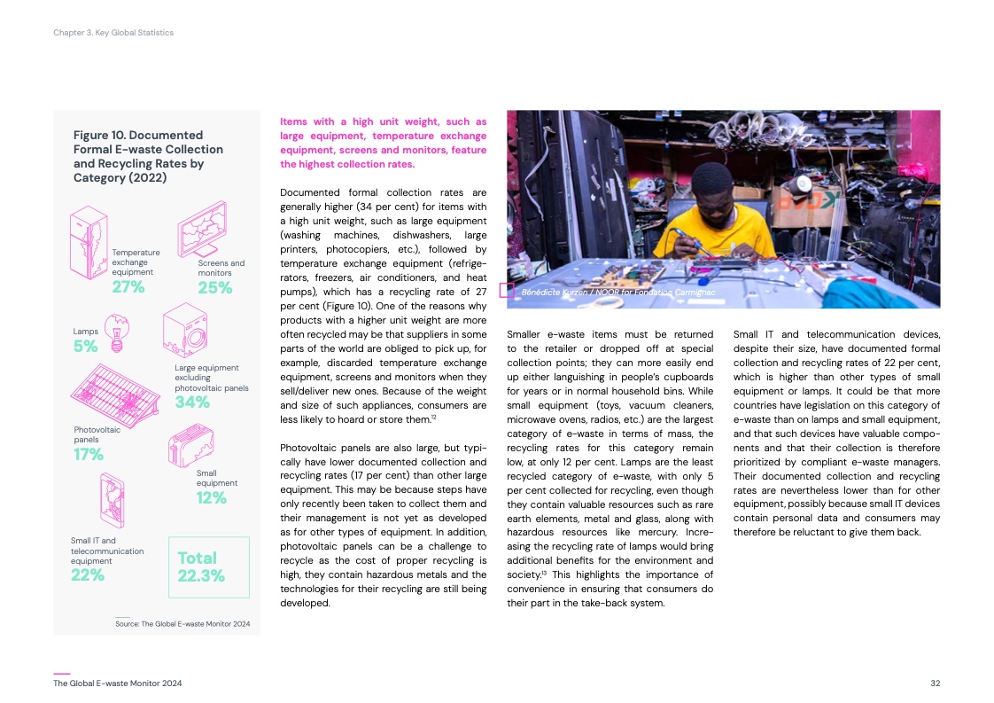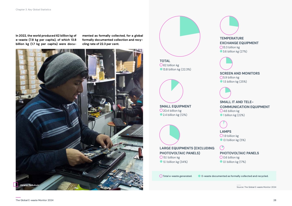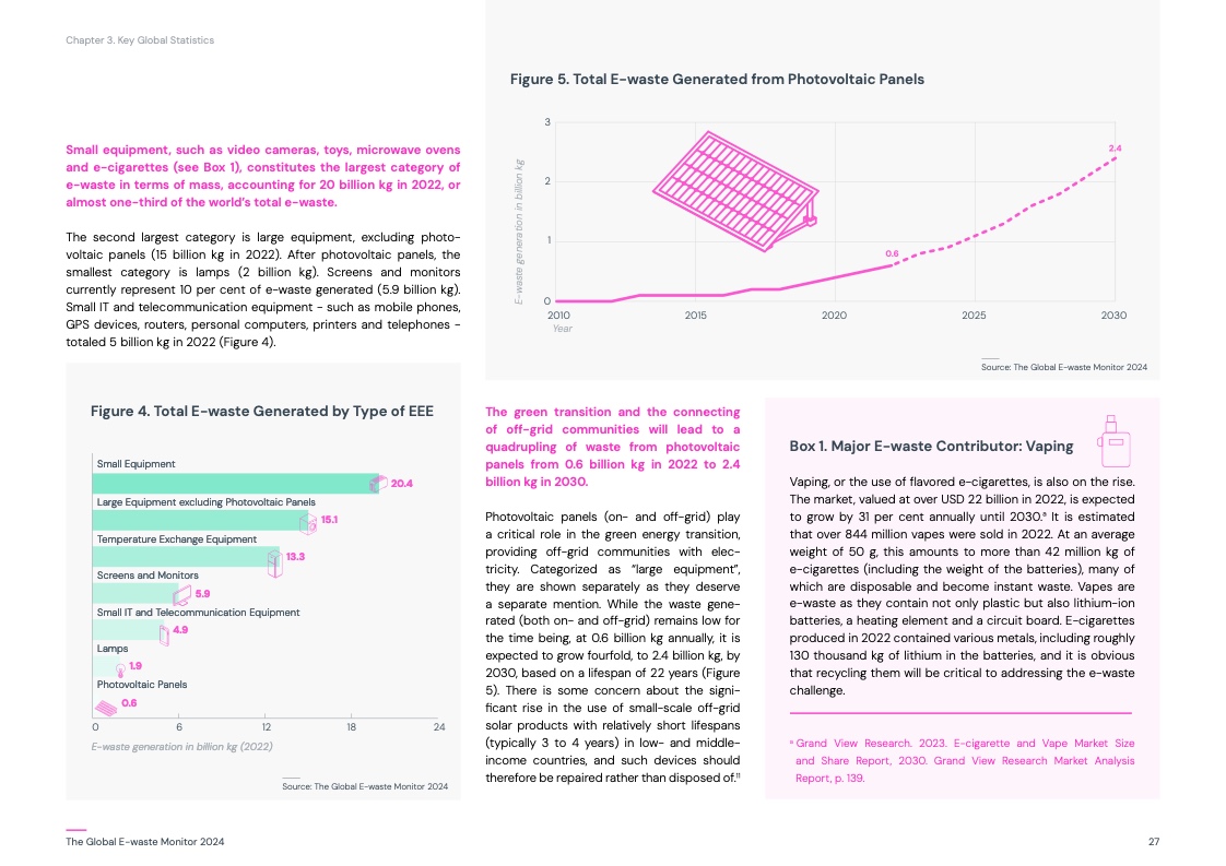 所谓电子废弃物,指的是任何带有插头或电池的废弃电子产品。其中,小型设备(如玩具、微波炉、吸尘器、电子烟)占到2022年电子废弃物的33%,重量达到2040万吨;此外,小型信息技术和电信设备类别的电子废弃物(如笔记本电脑、移动电话、全球定位系统设备、路由器)则重达460万吨。