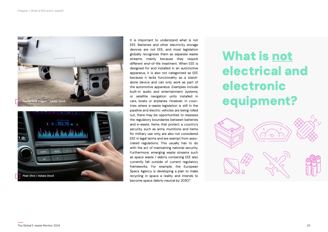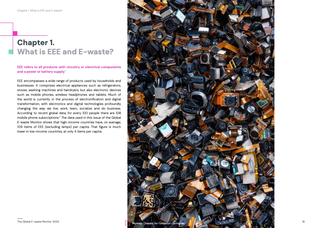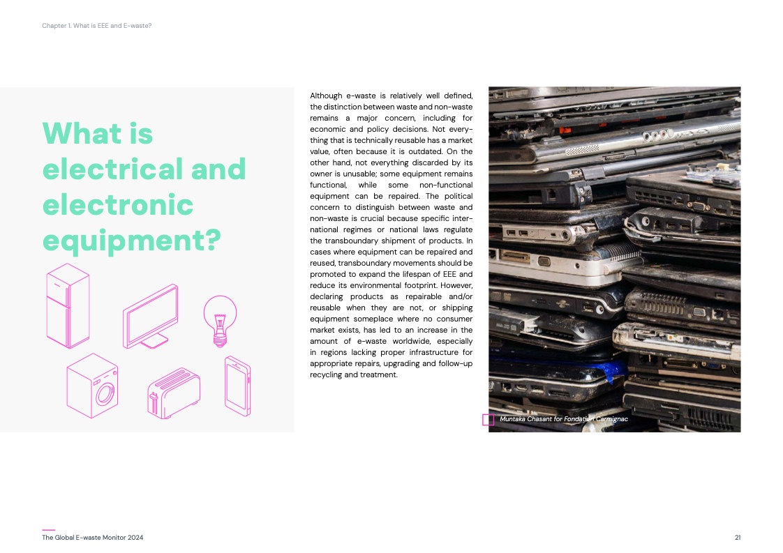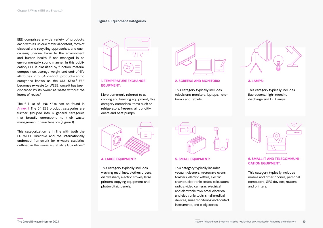 所谓电子废弃物,指的是任何带有插头或电池的废弃电子产品。其中,小型设备(如玩具、微波炉、吸尘器、电子烟)占到2022年电子废弃物的33%,重量达到2040万吨;此外,小型信息技术和电信设备类别的电子废弃物(如笔记本电脑、移动电话、全球定位系统设备、路由器)则重达460万吨。