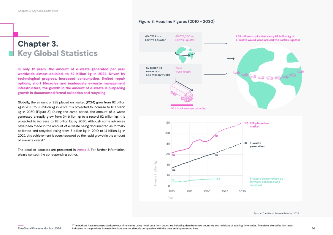 报告指出,这6200万吨电子废弃物将装满155万辆载重40吨的卡车,这些卡车首尾相接基本可以环绕赤道一圈。这些废弃物还相当于10.7万架全球最大(853座)、最重 (575吨)客机的重量,完全能够形成一个从纽约到雅典、从内罗毕到河内或从香港到安克雷奇的首尾相连的机队。