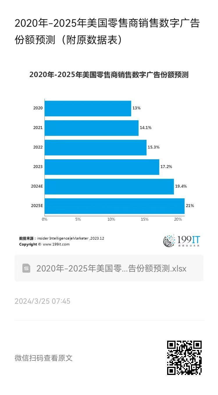 2020年-2025年美国零售商销售数字广告份额预测(附原数据表) ​​​