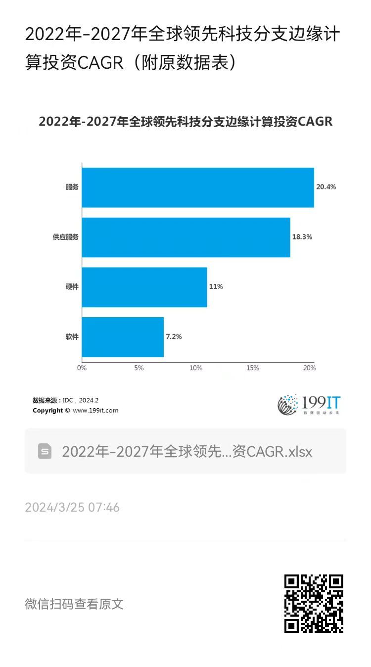 2022年-2027年全球领先科技分支边缘计算投资CAGR(附原数据表) 更多阅读:5G时代的边缘计算:中国的技术和市场发展(80页)Strategy Analytics:边缘计算在物联网部署中逐渐崛起阿里云朱照远:AI+超高清+边缘计算是下一代CDN的核心GSMA:5G时代的边缘计算5G引爆边缘计算!下一个万亿市场来临边缘计算、语音识别技术、人工智能将助力PropTech掀起商业地产大革命亚马逊云科技宣布Amazon Panorama Appliance正式可用,将计算机视觉应用引入边缘Omdia市场分析: 边缘计算对制造业、零售业和金融业的影IDC:2026年全球边缘计算支出将接近 3170 亿美元IDC:2027年日本边缘基础设施市场将达到2.4万亿日元IDC:2024年全球边缘计算支出将达到2320亿美元IDC:2024年边缘计算支出将达到2280亿美元IDC:2025年全球边缘计算支出达到2610亿美元AT&T:5G和边缘之旅IDC:2021年中国边缘计算服务器整体市场规模达到33.1亿美元 同比增长23.9%